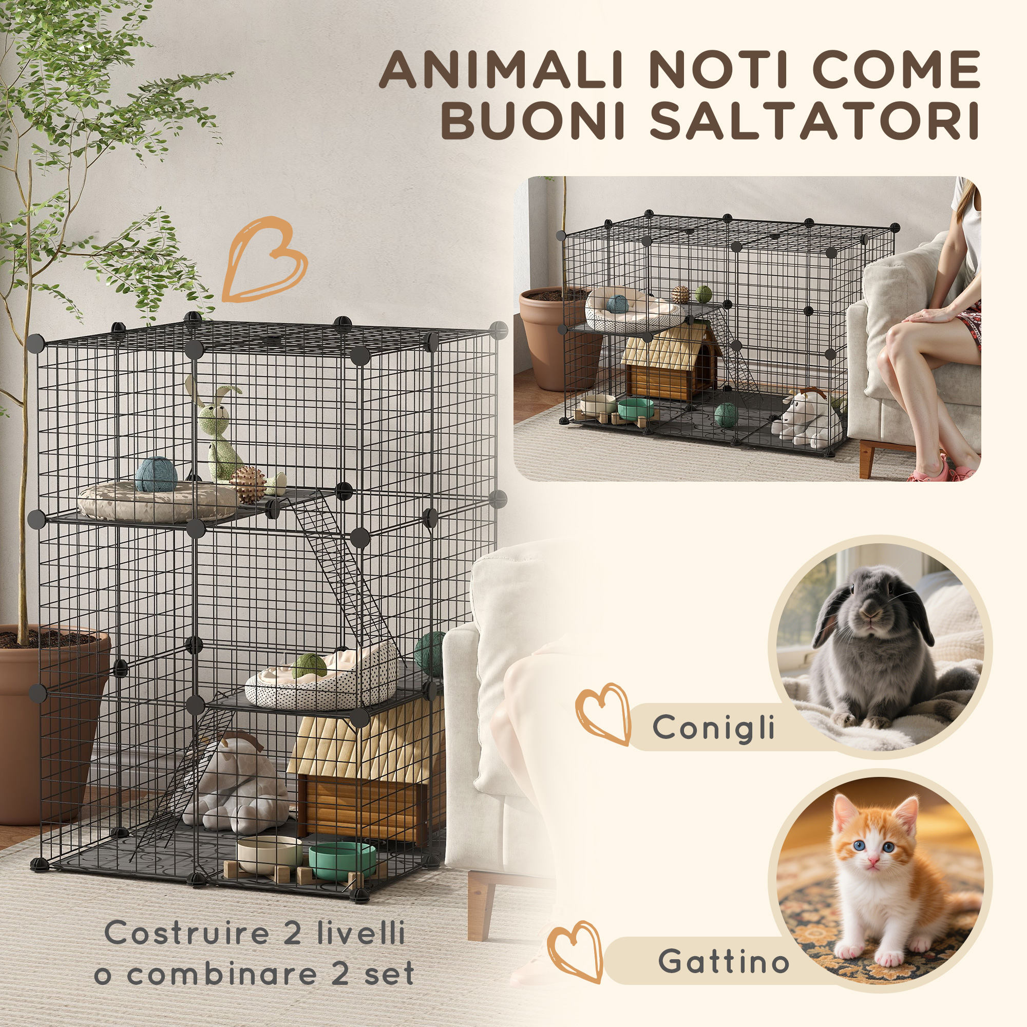 Crea uno spazio ideale per i tuoi piccoli animali con questo recinto per roditori, perfetto per conigli, cincillà e porcellini d’India, Offre un ampio spazio per giocare e sicurezza mentre sei fuori casa, Il sistema di connettori multi-angolari ne facilita il montaggio e lo smontaggio, adattandosi a qualsiasi spazio, Combinando praticità e comfort, questa gabbia per conigli è perfetta per garantire la tranquillità dei tuoi animali domestici in qualsiasi ambiente,