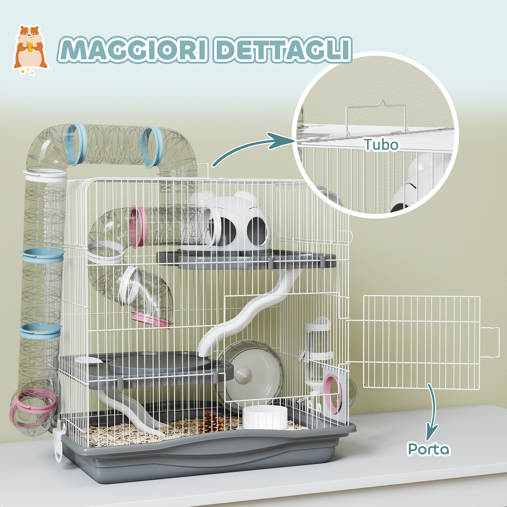 Gabbia per Criceti a 3 Livelli e 14 Tubi con Casetta, Rampa, e Accessori, in Metallo e Plastica, 45x30x45 cm, Grigio