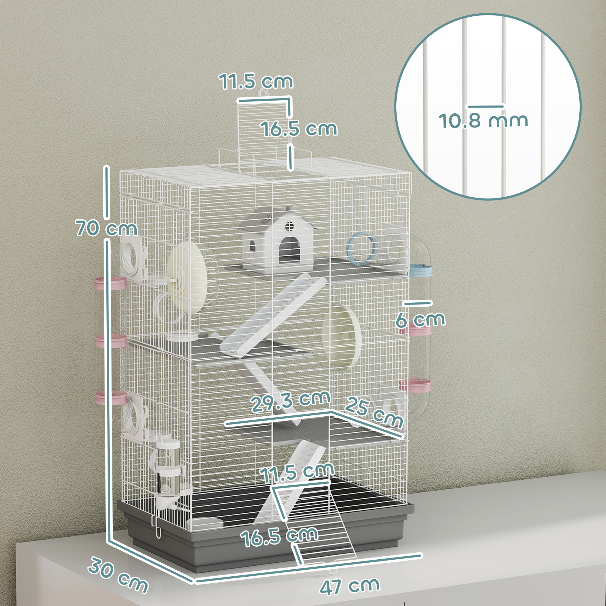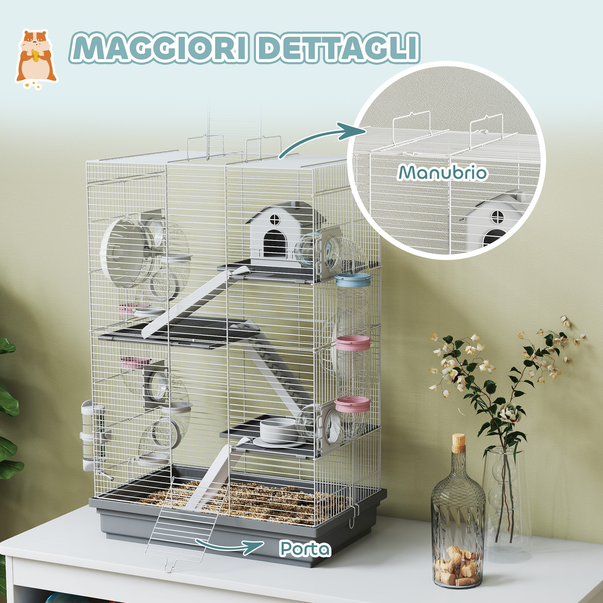 - • Lo spazio di 1,08 cm tra le maglie della gabbietta per criceti impedisce le fughe, garantendo la sicurezza del tuo animale