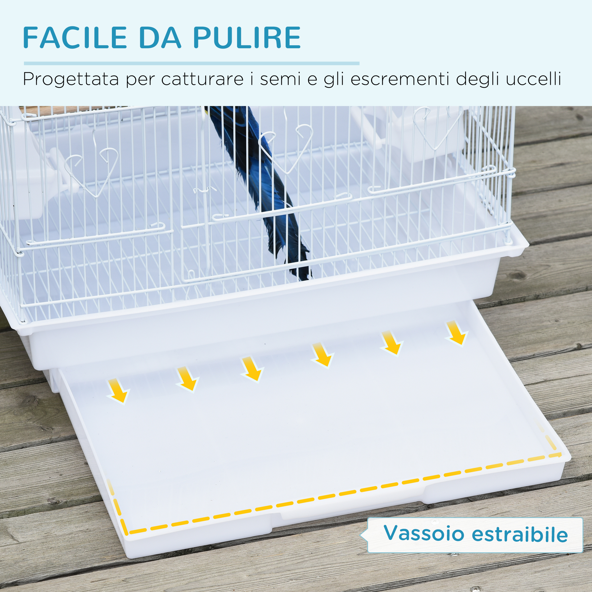 Gabbia per Uccelli Portatile con Maniglia, Vassoio Estraibile e Porte, Voliera per Pappagallini con Posatoi in Legno, Altalena e Ciotole per Cibo, 46,5×35,5x92cm, Bianco