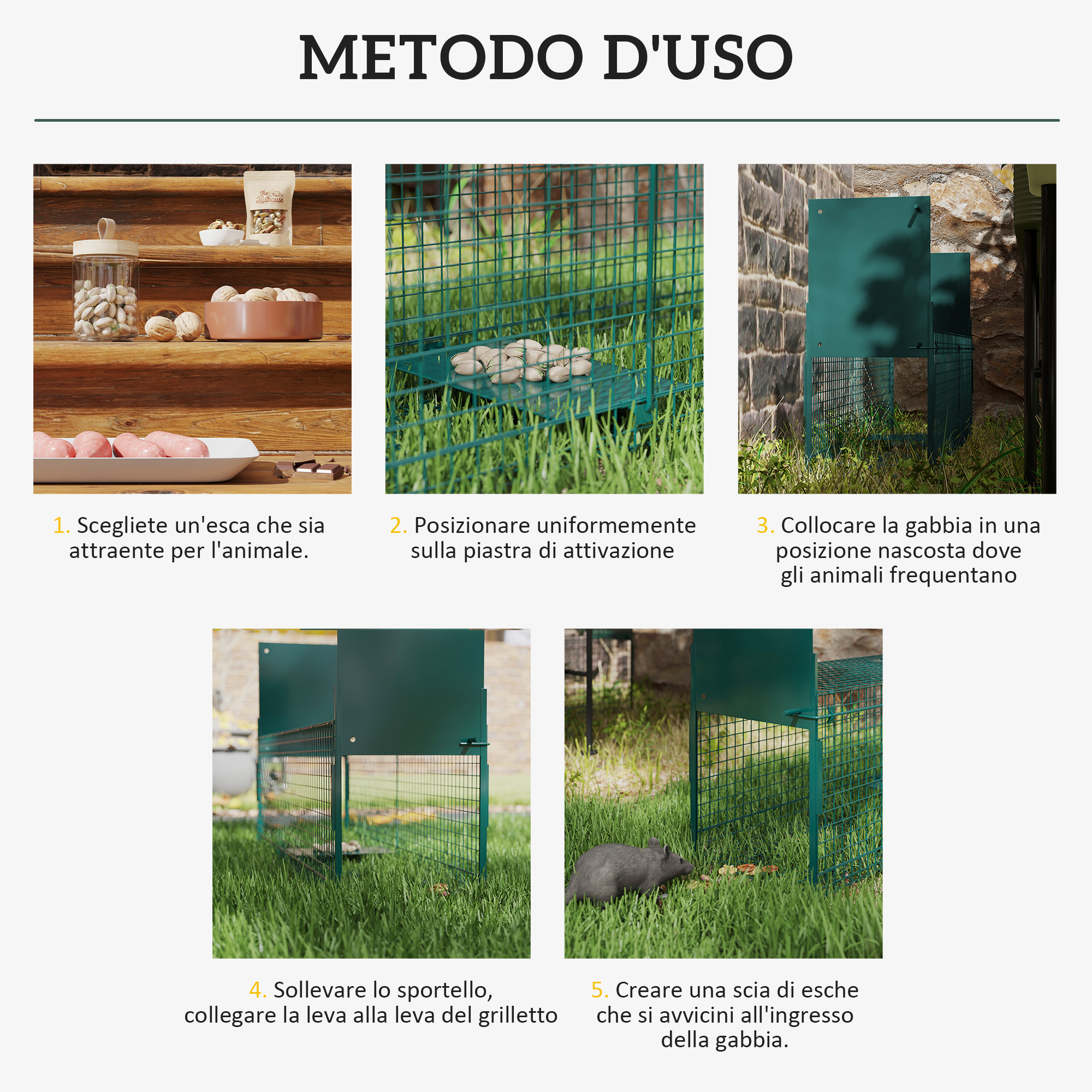 Questa gabbia trappola per animali ha un design a 2 ingressi ed è lunga, per permettere di catturare più animali, Il meccanismo di chiusura è molto sensibile ma allo stesso tempo sicuro, per garantirti di catturare gli animali senza ferirli, Può essere utilizzata sia in ambienti esterni che interni, Il colore verde scuro permette alla gabbia di confondersi con la vegetazione,