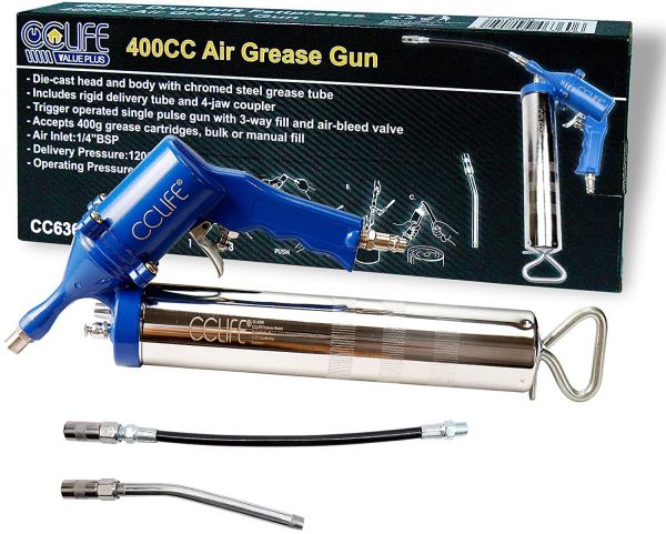 Questa pistola pneumatica è un aiuto indispensabile per il lavoro di lubrificazione in agricoltura, il lavoro automobilistico o per applicazioni di uso domestico e professionaleUtilizzabile sia con grasso sfuso che con cartucce da 400CCNella confezione sono presenti un tubo flessibile da 12′ e un tubo metallicoIntervallo di funzionamento dell’aria compressa 1200PSI – 6000PSIFilettatura di ingresso aria 1/8′ BSPT
