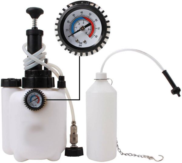 KIT 3Lt per Spurgo Freni Frizione Auto Pompa Aspirazione Ricambio liquido frenisistema di spurgo per freni e frizione, per spurgare freno e frizione in modo professionale.Senza necessità di alimentazione esternaSerbatoio da 3 l di liquido idraulicoLa gamma di pressione lo rende adatto per l’uso con sistemi ABS. Dotato di tappo con diametro da 42 mm, adatto per la maggior parte dei modelli europei.Robusto e facilita lo spurgo del freno su un’ampia varietà di tipi di veicoli.Dati tecniciCapacità: circa 3 lt.Il serbatoio di aspirazione: 1LPressione di esercizio: 2 bar / 30 psiPressione massima: 4 bar / 60 psi (consigliata)Manometro 6bar / 60psiMateriale: plasticaColore: bianco