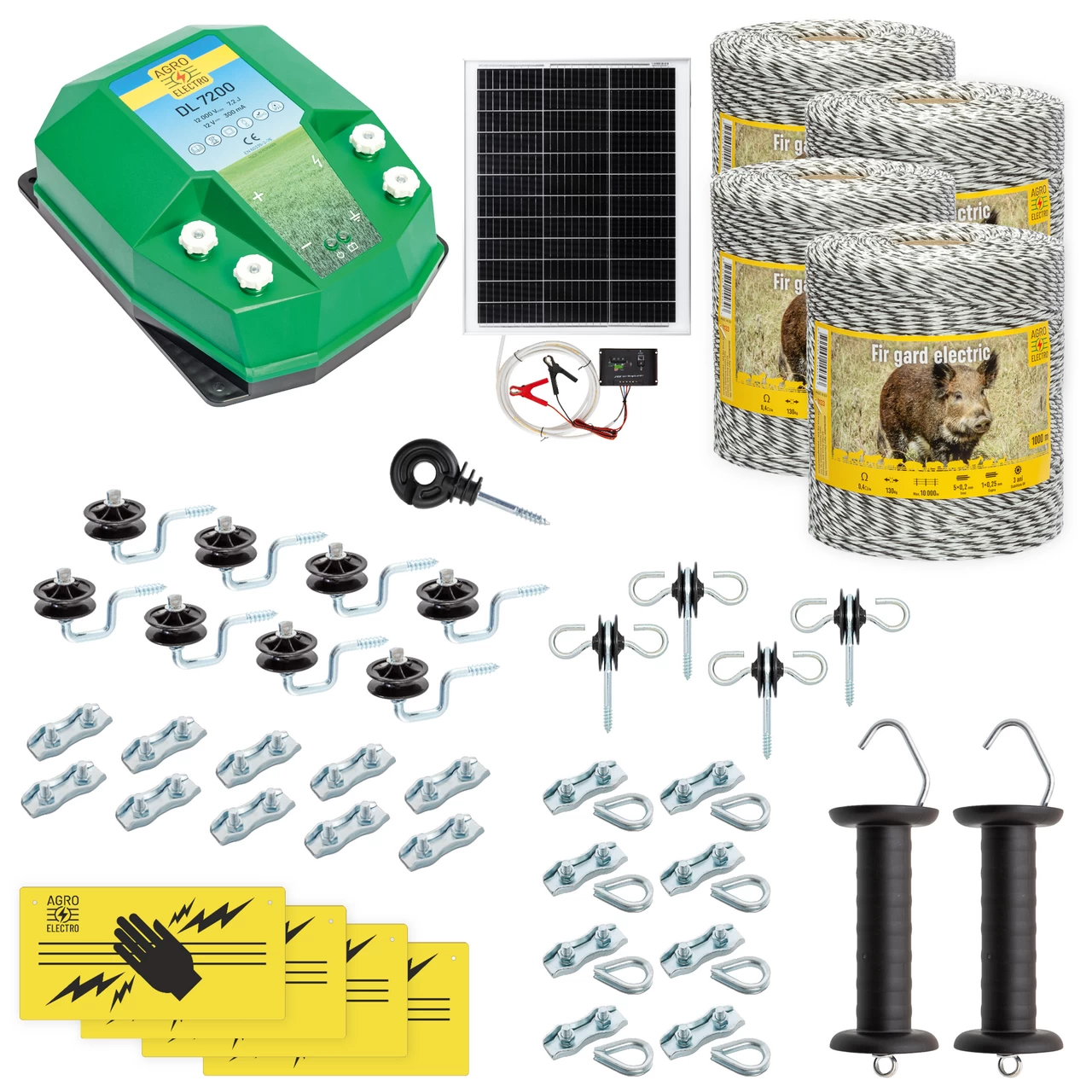 Kit completo recinto elettrico per animali selvatici. Il kit contiene un’elettrificatore con potenza di 7,2 Joule, filo 4000 m, isolatori anulari, isolatori di angolo, connettori, maniglia e isolatori per cancello.