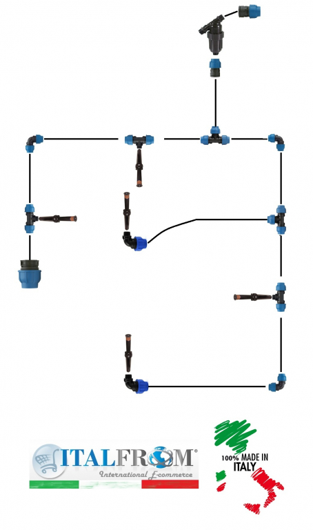 Il kit completo Italfrom è studiato per la microirrigazione interrata su una superficie fino a 50 metri quadrati, e consente di creare un impianto di irrigazione in pochi e semplici passi; rende accessibile alla portata di tutti la più alta tecnologia utilizzata nella microirrigazione. Il kit è facile da montare e non necessita di attrezzi professionali. Prodotti di qualità professionale uniti ad una elevata sempicità di installazione. All’interno del kit sono presenti tutti i tubi, i raccordi e le valvole necessarie alla creazione di un impianto di microirrigazione interrata di stampo professionale. Il seguente prodotto è un kit per l’irrigazione “Pronto all’uso” che permette una distribuzione uniforme dell’acqua e dei nutrienti vicino alle radici delle painte. Inoltre rende disponibile la più alta tecnologia disponibile nella microirrigazione ad un costo accessibile per tutti.