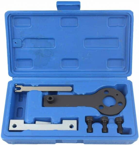 strumento di fasatura impostato per bloccare albero a camme e albero motore quando si cambia cinghia di distribuzione su motori a benzina Fiat e Chrysler 1.1 Eco, 1.2 e 1.4 8V litri. Aiuta a impostare i tempi nella posizione corretta.Motori: – 1.1, 1.2 e 1.4 8v litriCodici motore: – 187A1.000, 169A4000, 188A4.000, 199A4.000, 199A7.000 e 350A1.000OEM: – 303-1479, 2.000.004.400, 2190754400 – 303-1480, 2.000.004.500, 2190754500Il set include: – utensile di bloccaggio albero motore – staffa di bloccaggio albero a cammeFiat- Panda (2003-2012)- Seicento (1998-2004)- Punto (1999-2013)- Punto EVO (2009-2012)- Grande Punto (2007-2008)- 500 (seit 2008)- Doblo (2006-2010)- Doblo / Cargo (seit 2005)Chrysler- Ypsilon (seit 2011) Motore:- 1,1, 1,2 und 1,4 8 V Liter Codice motore :- 187A1.000, 169A4000, 188A4.000, 199A4.000, 199A7.000 und 350A1.000OEM:- 303-1479, 2.000.004.400, 2 190 754 400- 303-1480, 2.000.004.500, 2 190 754 500