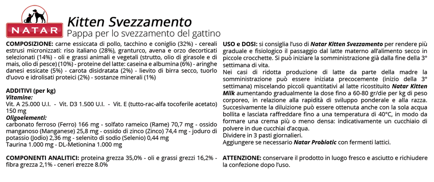 Nei casi di ridotta produzione di latte da parte della madre la somministrazione può essere iniziata precocemente (inizio della 3° settimana) miscelando piccoli quantitativi al latte ricostituito Natar Kitten Milk aumentando gradualmente la dose fino a 60-80 gr/die per kg di peso corporeo, in relazione alla rapidità di sviluppo ponderale e alla razza.