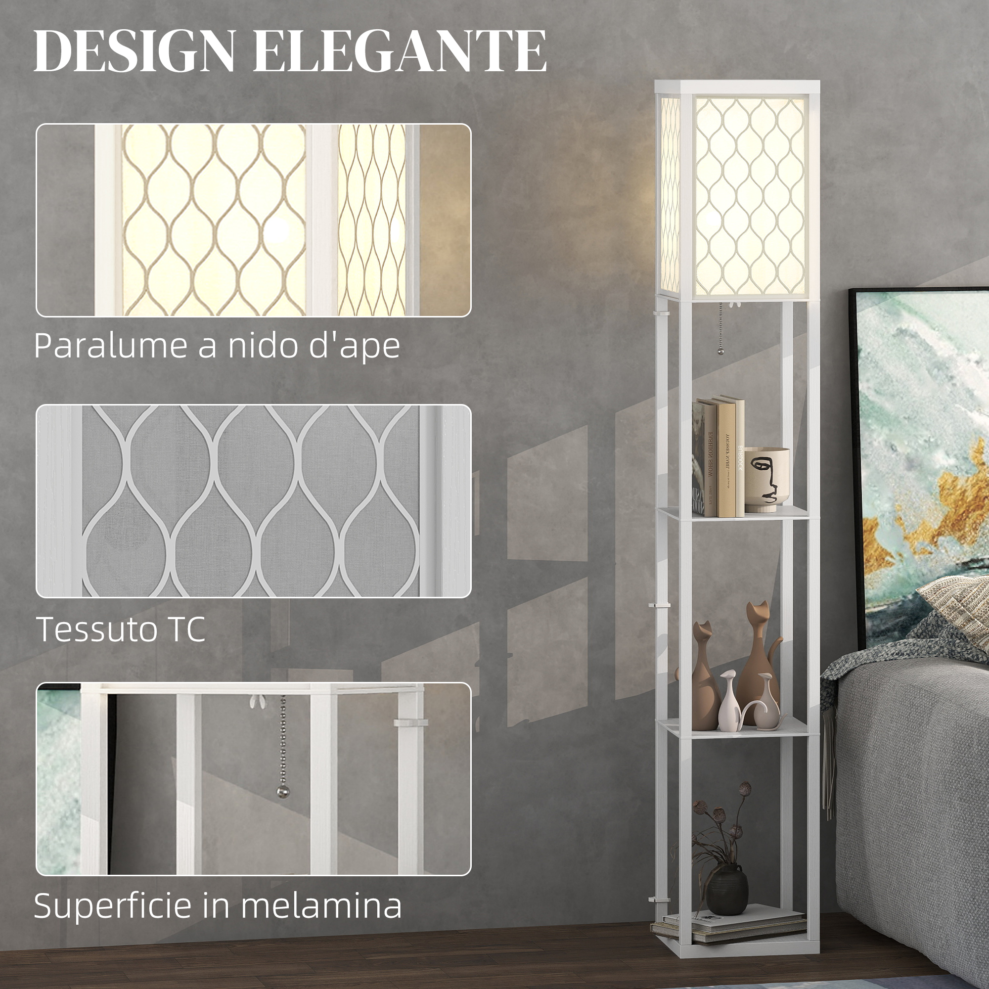 Questa lampada da terra con mensole ha un design 2 in 1, che offre sia illuminazione che spazio per riporre oggetti, Questa lampada da camera da letto consente di esporre e organizzare i tuoi accessori e i libri grazie alle sue 3 mensole, Il suo colore neutro con paralume in tessuto a nido d’ape, aggiungerà un tocco di originalità e modernità al tuo arredamento,