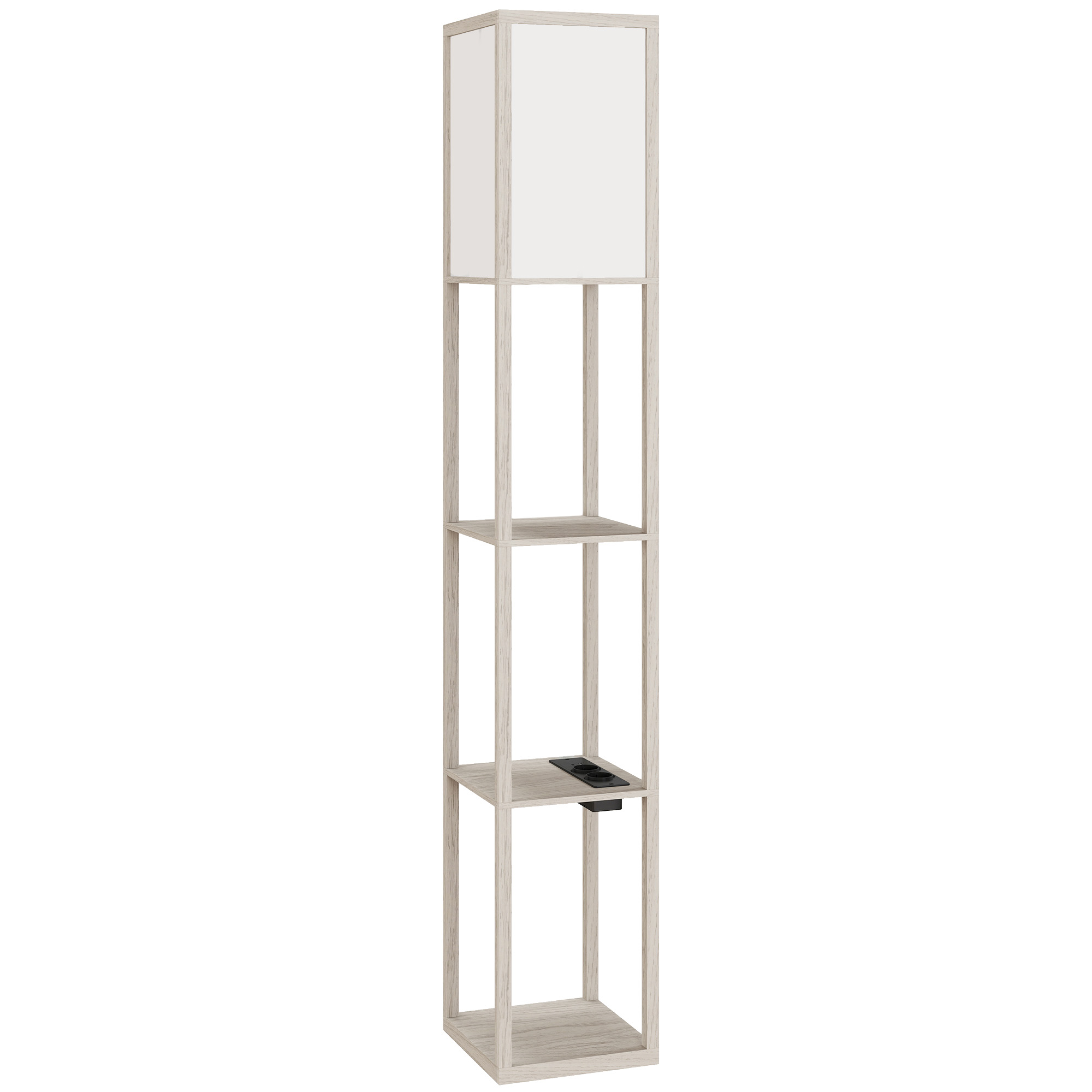 Lampada da Terra con Ripiani, Luce Regolabile, Interruttore a Pedale e Porte USB, Bianco e Rovere