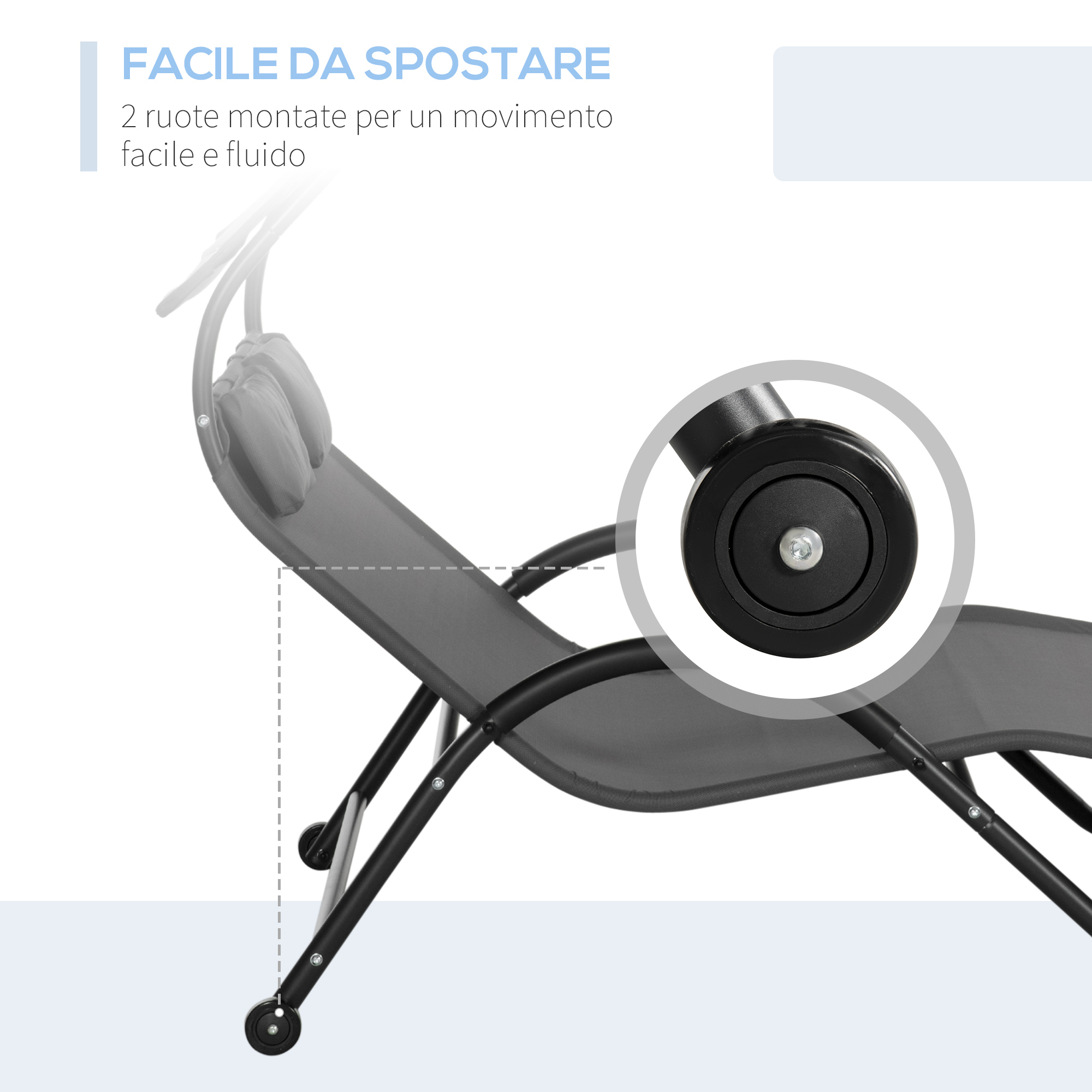 - COMODO E PRATICO: Il poggiatesta con cuscino imbottito e i robusti braccioli del lettino prendisole aggiungono ulteriore comfort e comodità alla tua esperienza di relax al sole. Le ruote inferiori rendono il lettino facilmente spostabile e trasportabile per portarlo comodamente dove serve.