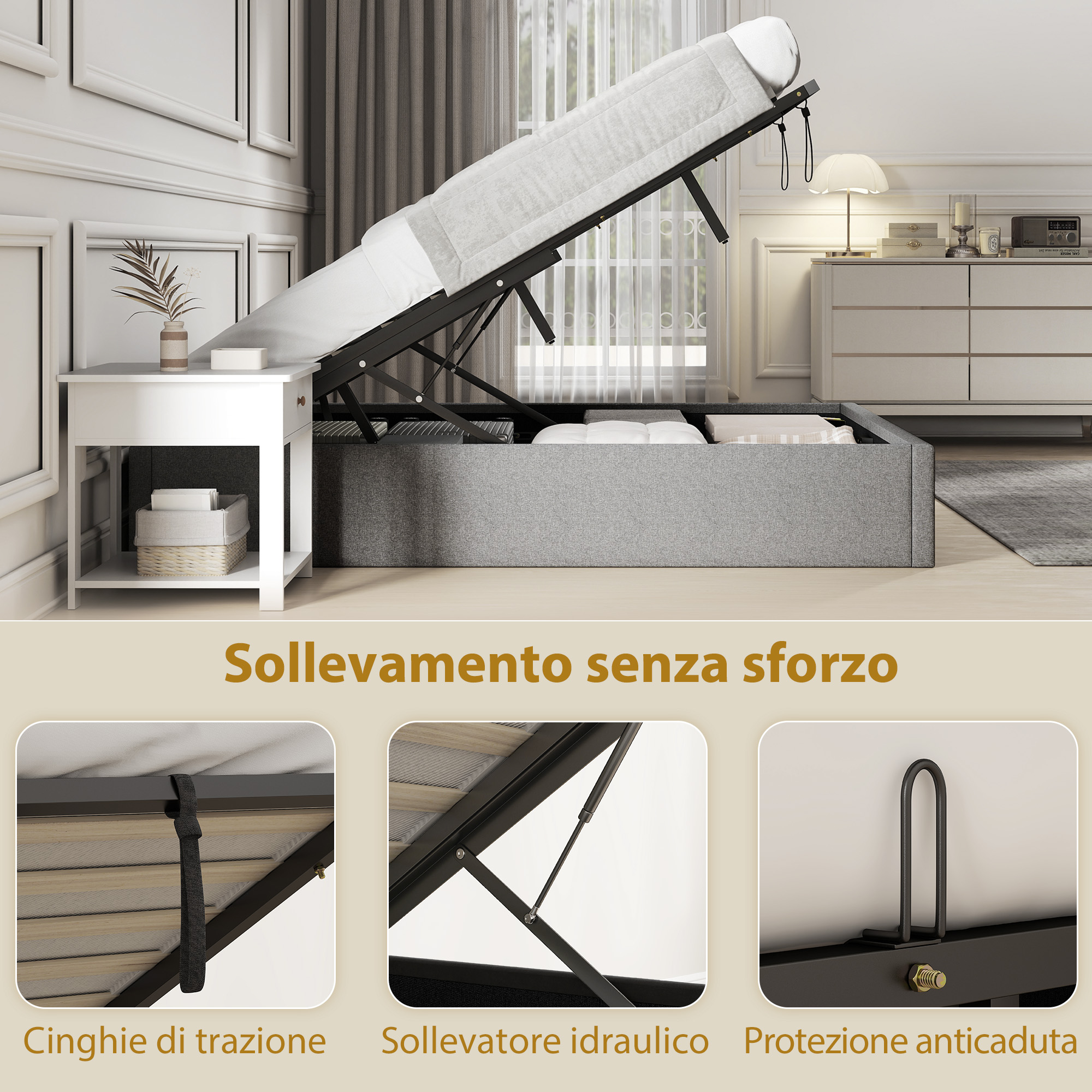 • • Il design anti-caduta mantiene il materasso stabile durante il sollevamento del letto per accedere al vano contenitore