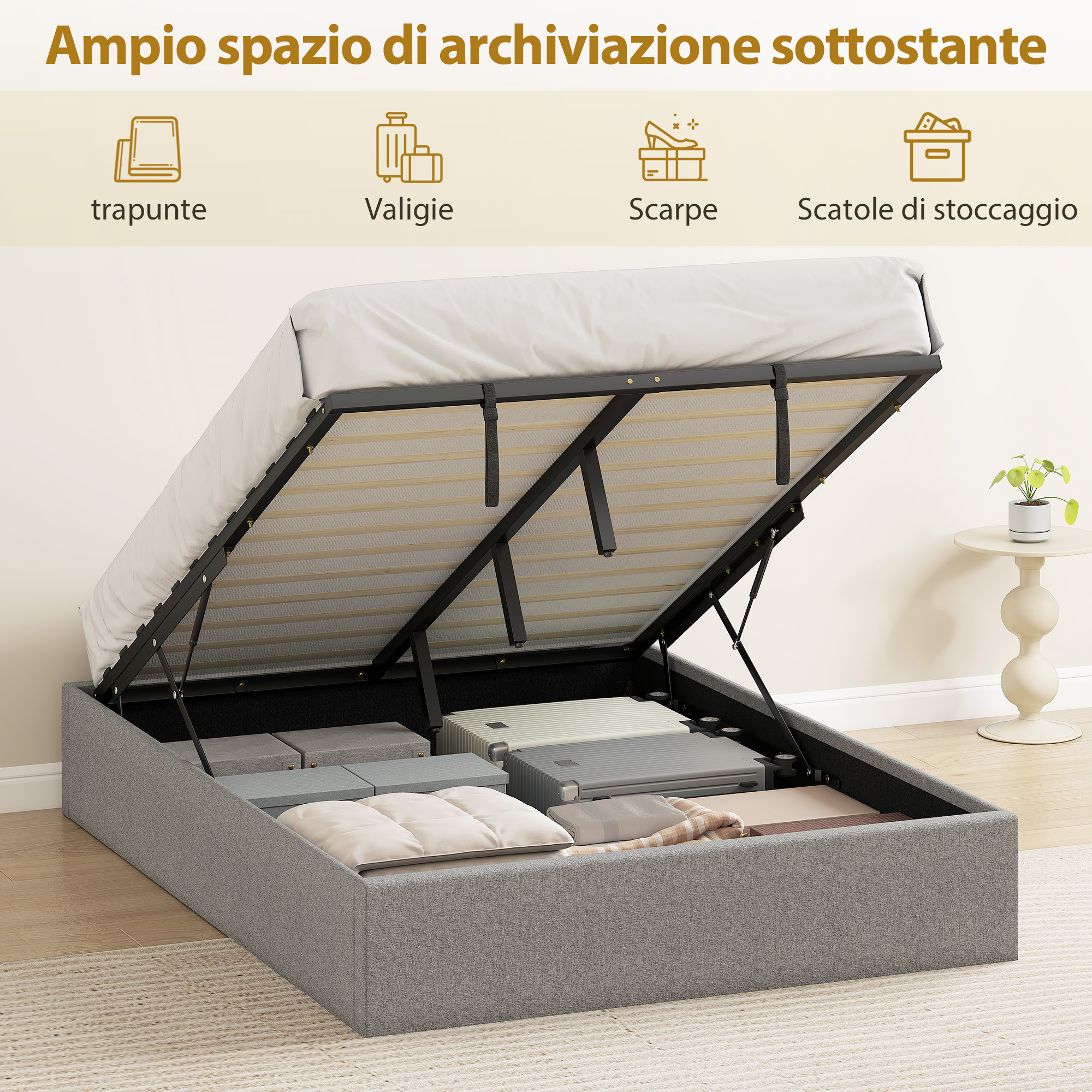 Il letto contenitore di [ITALFROM HOME DESIGN] trasforma il tuo spazio con un sistema di sollevamento facile da usare, rivelando un posto sicuro dove riporre biancheria da letto, cuscini o valigie, Rivestito in tessuto effetto lino per garantire calore e stile, combina un solido supporto in eucalipto e metallo con doghe in pioppo per garantire stabilità, I piedini in EVA proteggono il pavimento dai graffi ed evitano rumori, rendendo la tua camera da letto accogliente,