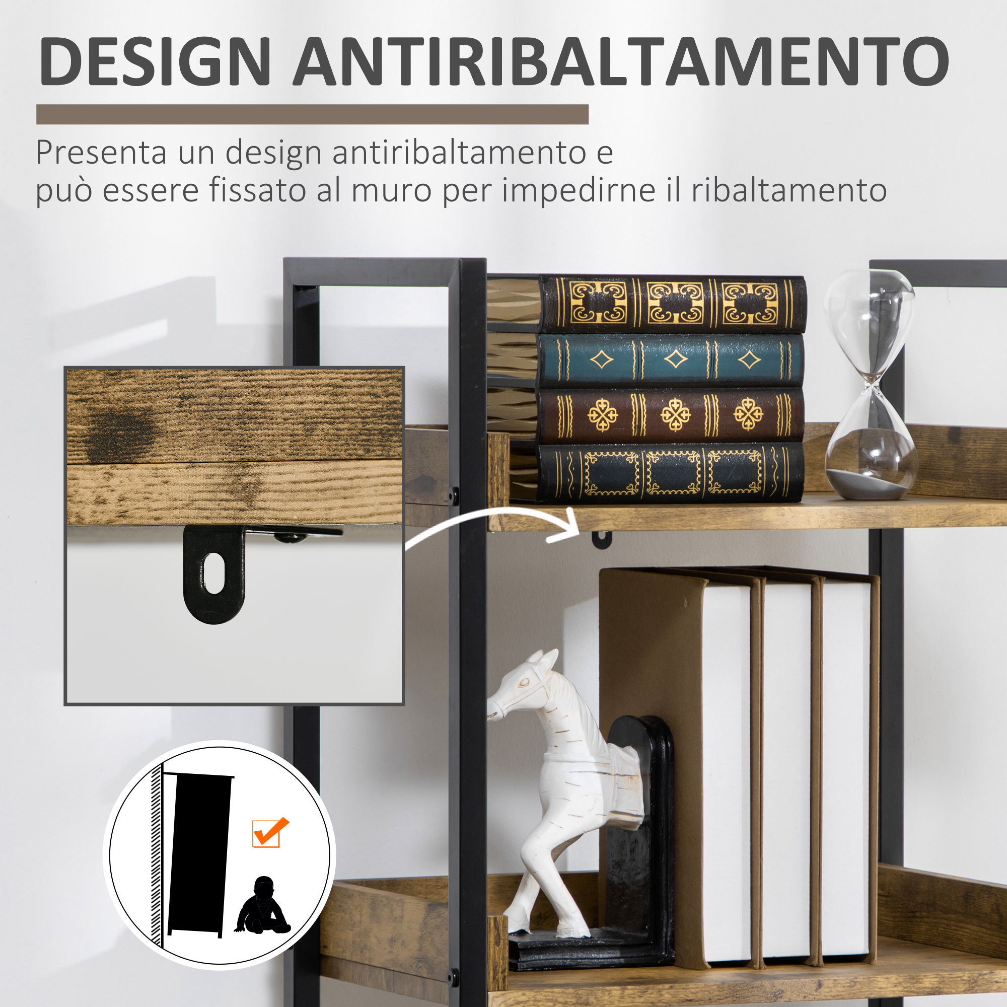 - STRUTTURA ROBUSTA: Il telaio della libreria in metallo assicura solidità e mantiene la struttura stabile. Inoltre, il dispositivo antiribaltamento da fissare al muro rende il mobile più sicuro e aumenta la stabilità.