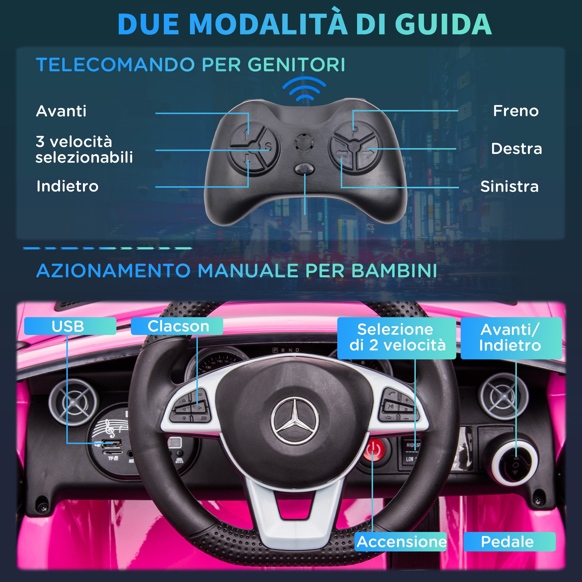• • Macchinina elettrica con telecomando per il controllo parentale