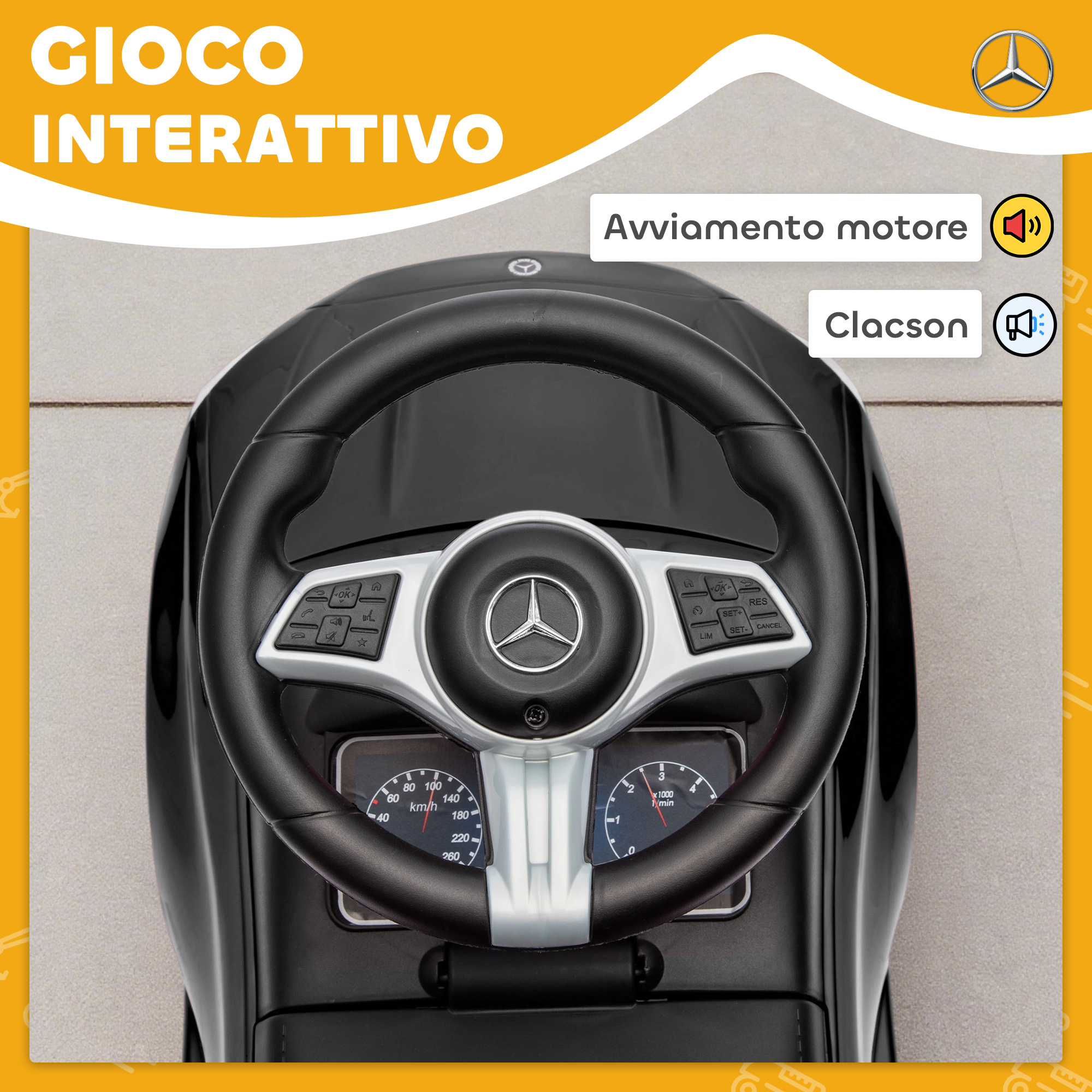 Macchina per Bambini Licenza Mercedes Benz con Clacson e Spazio Portaoggetti, 65x28x39 cm, Nero