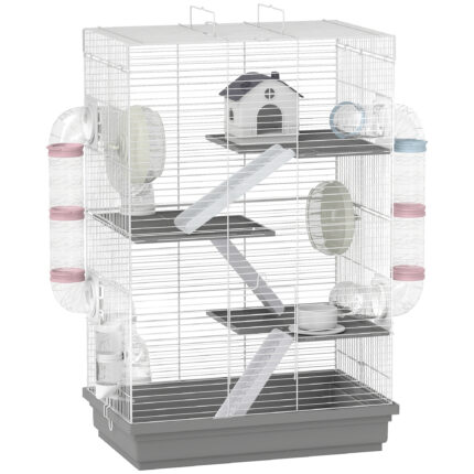 Gabbia per Criceti a 4 Livelli e 16 Tubi con Casetta, Rampa, e Accessori, in Metallo e Plastica, 47x30x70 cm, Grigio