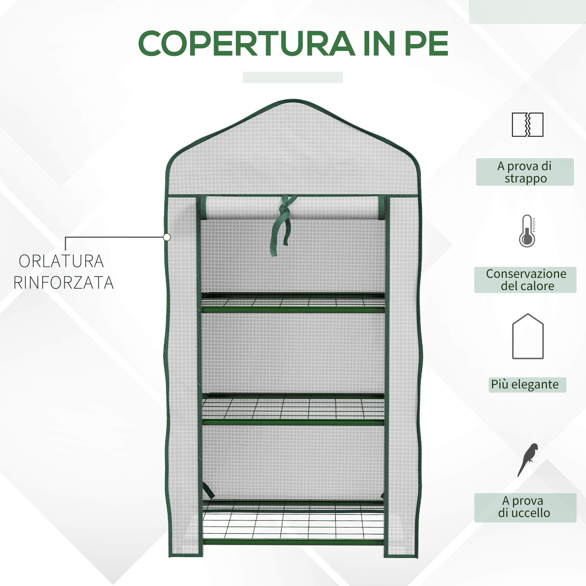 • • Serra da giardino con orlo della copertura rinforzato per resistere agli strappi