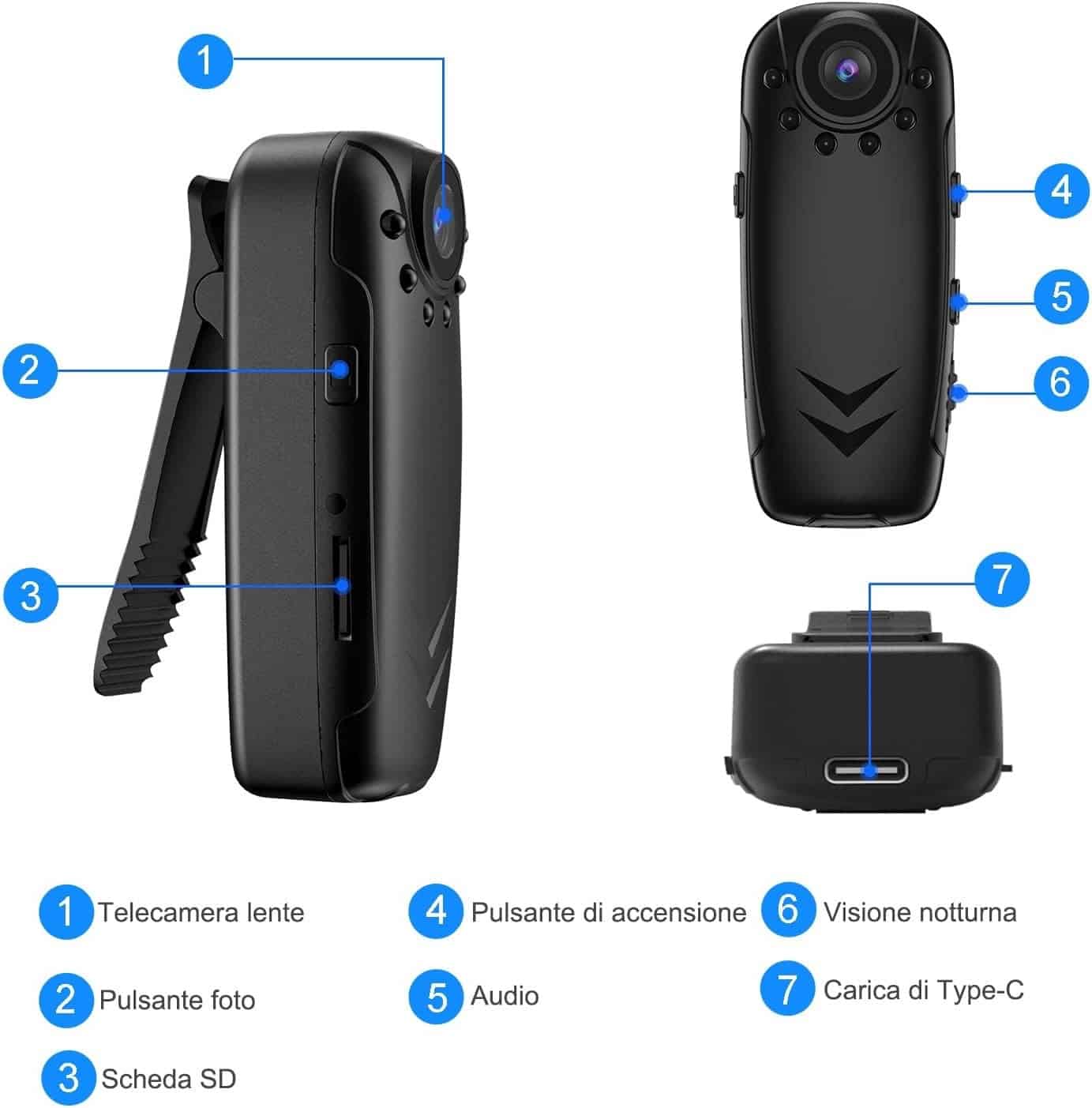 - ⚙️ Ampia Compatibilità e Facilità d’UsoInclude memoria integrata da 32GB, supporto magnetico e attacco filettato per il montaggio su treppiedi, bici o superfici metalliche.Si accende e registra con un solo tasto, senza bisogno di configurazioni complesse.