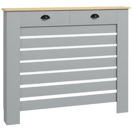 Copritermosifone in MDF a Doghe, Copricalorifero a Griglia con 2 Cassetti, 111x19x95,5 cm, Grigio