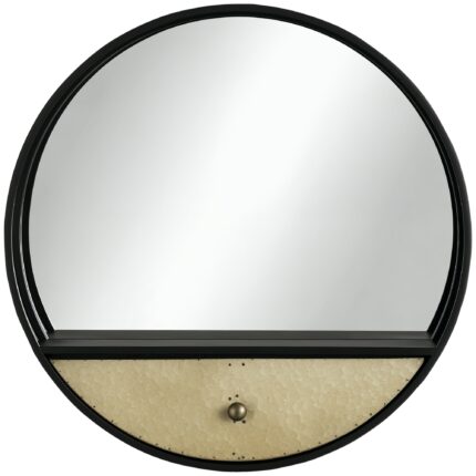 Specchio da Parete Rotondo da Ø61cm con Cassetto e Cornice in Metallo Nero