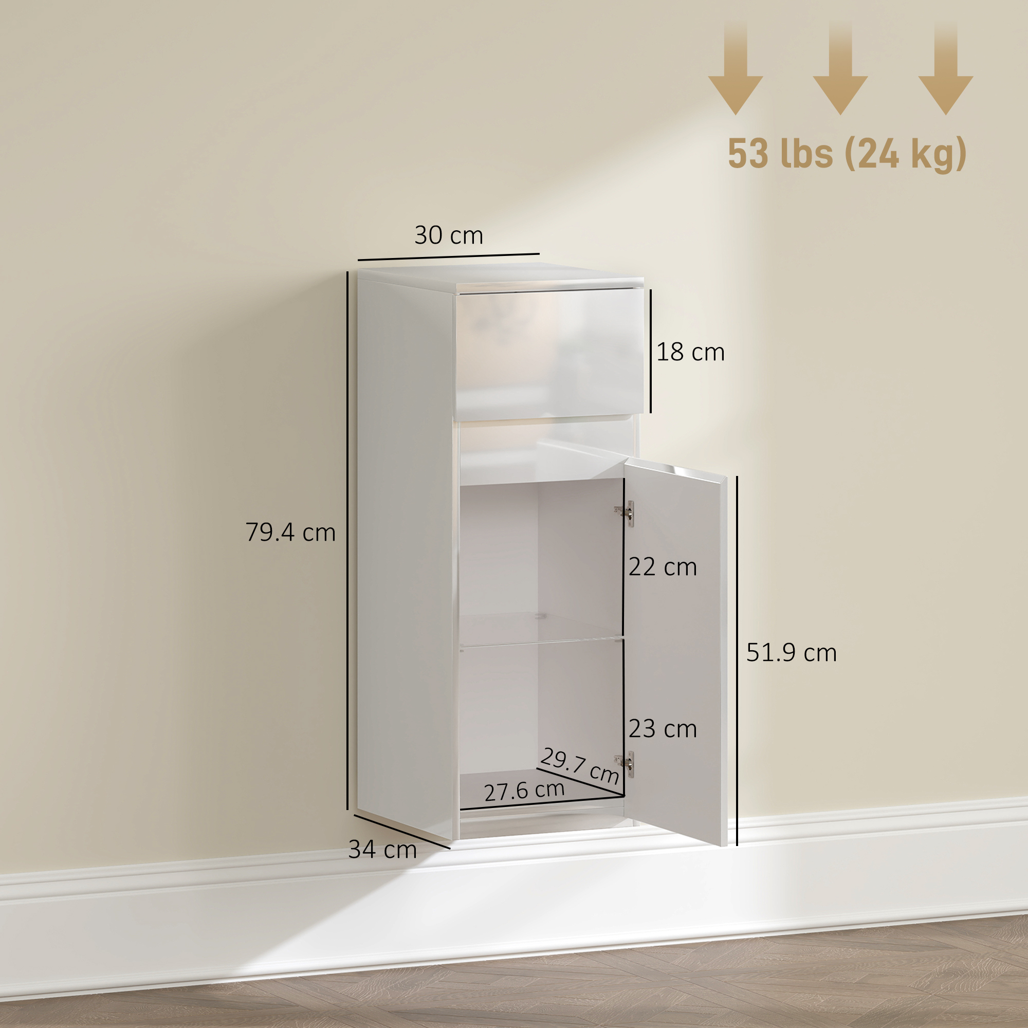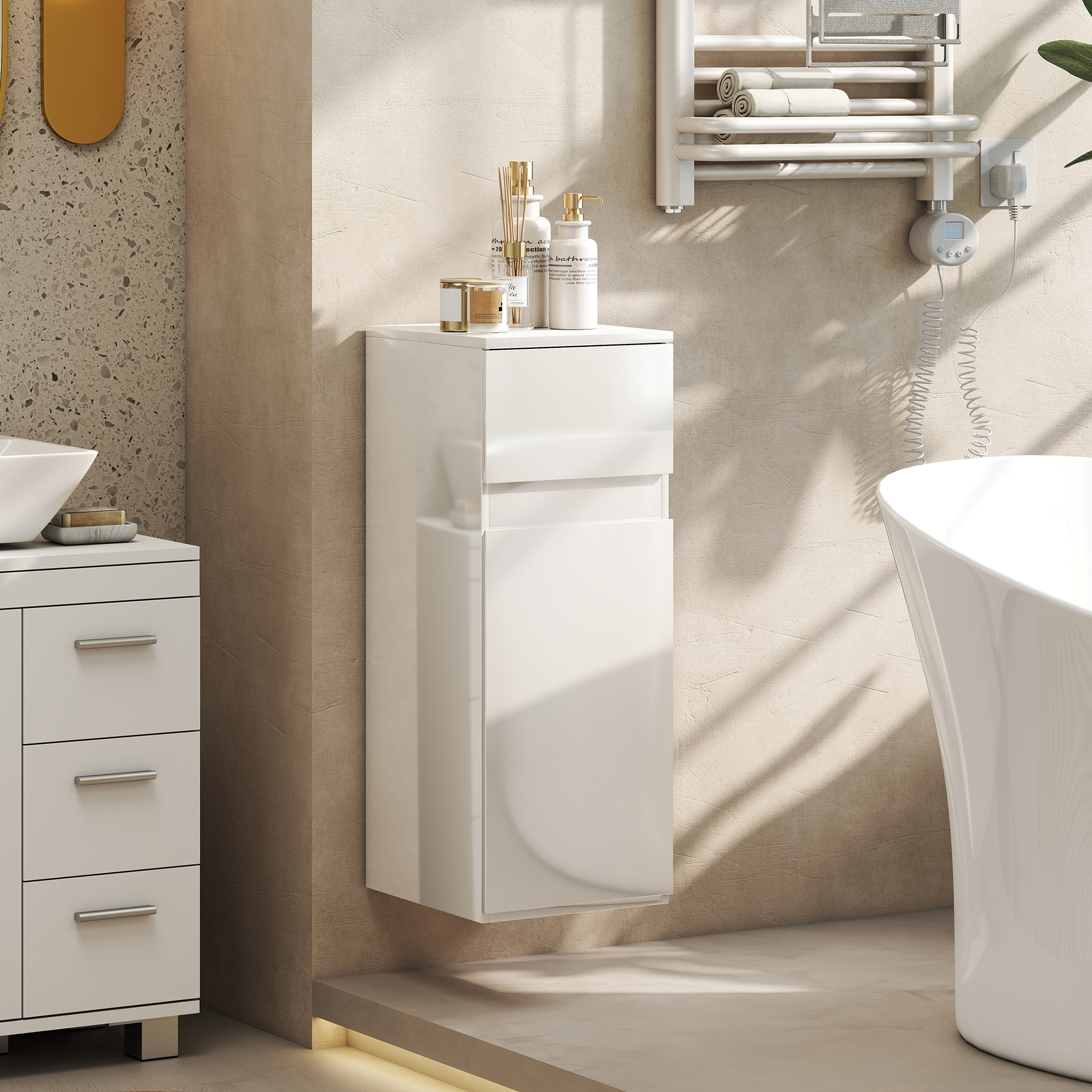 Mobiletto Bagno Sospeso con Cassetto, Anta Lucida e Ripiano in Vetro Regolabile, Bianco