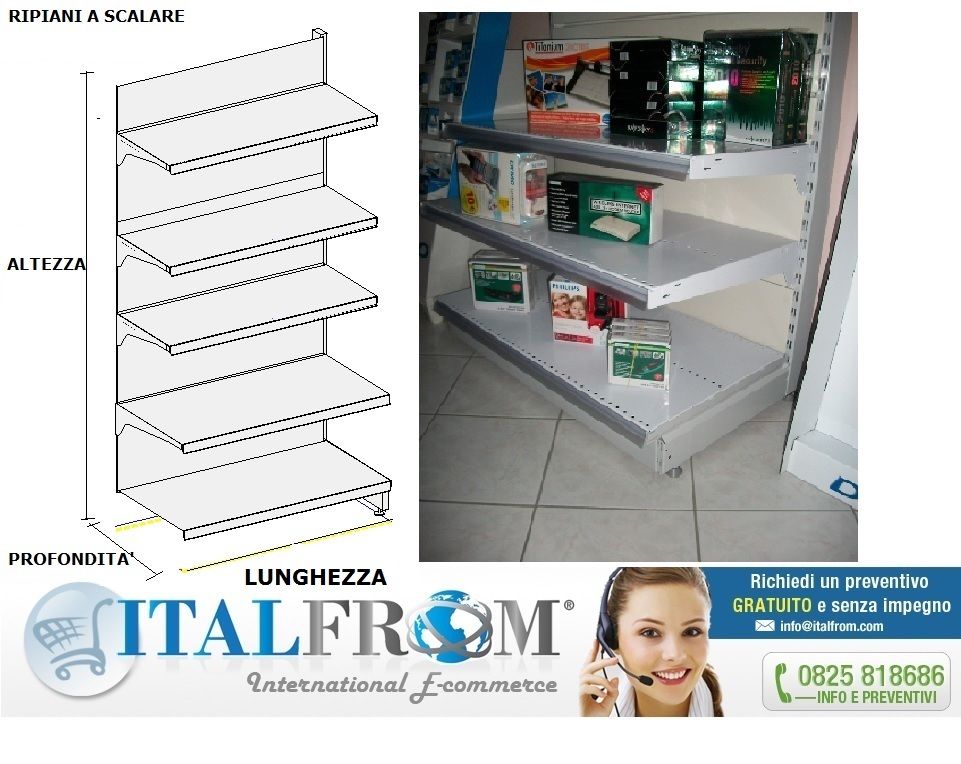 DESCRIZIONE MATERIALE IN VENDITAscaffalatura da esposizione componibile verniciata MODULO CONTINUATIVO Scaffale murale L 133, H 200 , Prof.base 50 cm + 4 ripiani da 40 cm( regolabili in base alle vostre esigenze ) portaprezzo in Pvc in dotazione Dettaglio fornitura :- n° 1 montante H cm. 200 con asolatura – n° 1 piano di base di cm. 133×50- n° 1 piano con mensole regolabile in altezza di cm. 133×50- n° 3 piani con mensole regolabili in altezza di cm. 133×40 – n° 1 zoccolo di rifinitura frontale antipolvere – n° 1 coppia di piedi terminali (sinistro e destro) – n° 1 schiena schiena liscia h 200 cm- portaprezzi per tutti i ripiani con colore a scelta VANTAGGI DEL PRODOTTO – SICUREZZA MADE IN ITALY – MERCE CERTIFICATA – SEMPLICITA’ DI MONTAGGIO ( COMPLETAMENTE AD INCASTRO ) – COLORE SCAFFALE : BIANCO- COLORE PORTAPREZZO A SCELTA : TRASPARENTE,ROSSO,VERDE,BLU,GIALLO- ESTREMA VERSATILITA’ – SI ADDICE A QUALSISASI SPAZIO ESPOSITIVO – POSSIBILITA’ DI AMPLIARE A PIACERE LA STRUTTURADESCRIZIONE PRODOTTO CERTIFICATO MADE IN ITALY Scaffalatura testata e sicura adatta ad arredare dal piccolo negozio al grade cento di distribuzione Versatilità ed eleganza egli accessori, finiture di qualità, concetti di design di interni innovativi, per creare un ambiente spettacolare che mettere in evidenza ogni articolo; materiali di qualità certificata, strutture resistenti nelle aree heavy duty e di stoccaggio materiali ingombranti; una vasta scelta di ripiani e fondali concepiti per le più diverse esigenze espositive: nessun dettaglio è lasciato al caso, per garantire sempre la massima affidabilità delle attrezzature e l’utilizzo migliore di qualunque area di vendita. Siamo a Vostra disposizione per preventivi personalizzati anche in 3D :