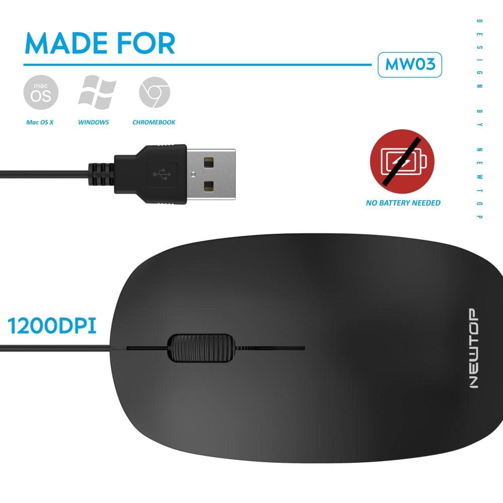 Mouse con Cavo USB 1200 DPI Nero Newtop MW03 – Comfort e PrecisioneMouse con Cavo USB 1200 DPI Nero Newtop MW03 – Comfort e PrecisioneIl mouse con cavo Newtop MW03 è progettato per offrire comfort durante l’uso prolungato, grazie alla sua leggerezza e design ergonomico. Perfetto per chi cerca un dispositivo semplice da usare e altamente efficiente.Caratteristiche PrincipaliLeggero e Comodo: Con un peso di soli 47 grammi, il mouse si adatta comodamente alla mano, riducendo l’affaticamento durante l’uso prolungato.Facile Configurazione e Utilizzo: Plug and Play semplifica la configurazione; basta collegarlo alla porta USB del computer per iniziare subito a usarlo.Controllo Uniforme del Cursore: Il sensore ottico da 1200 DPI offre un controllo preciso, ideale per la modifica di documenti e la navigazione web.Specifiche TecnicheTipo di connessione: Cavo USB da 125 cmMetodo di tracciamento: InfrarossiDPI (Min/Max): 1200Sensore: Sunplus 168ANumero di tasti: 3Distanza pressione tasto: 0,7 mmDurabilità pulsanti: Fino a 5 milioni di cicliVoltaggio: DC 5V / <100mASistemi operativi supportati: Windows 7 / 8 / 10 e Mac OS 10.3 o successiviDimensioni: 124,2 mm x 68,2 mm x 39,5 mmLunghezza cavo: 1,5 m (cavo in gomma)Peso: 47 gPerché Scegliere il Mouse Newtop MW03?Ideale per chi cerca un mouse leggero e facile da usare, con un'ottima precisione per tutte le attività quotidiane al computer.Il design ergonomico e la leggerezza del dispositivo assicurano comfort anche durante l'uso prolungato.Meno Fatica per Uso ProlungatoCon il mouse Newtop MW03, puoi lavorare o giocare per ore senza affaticarti, grazie al suo design leggero e comodo, combinato con una precisione ottica affidabile.