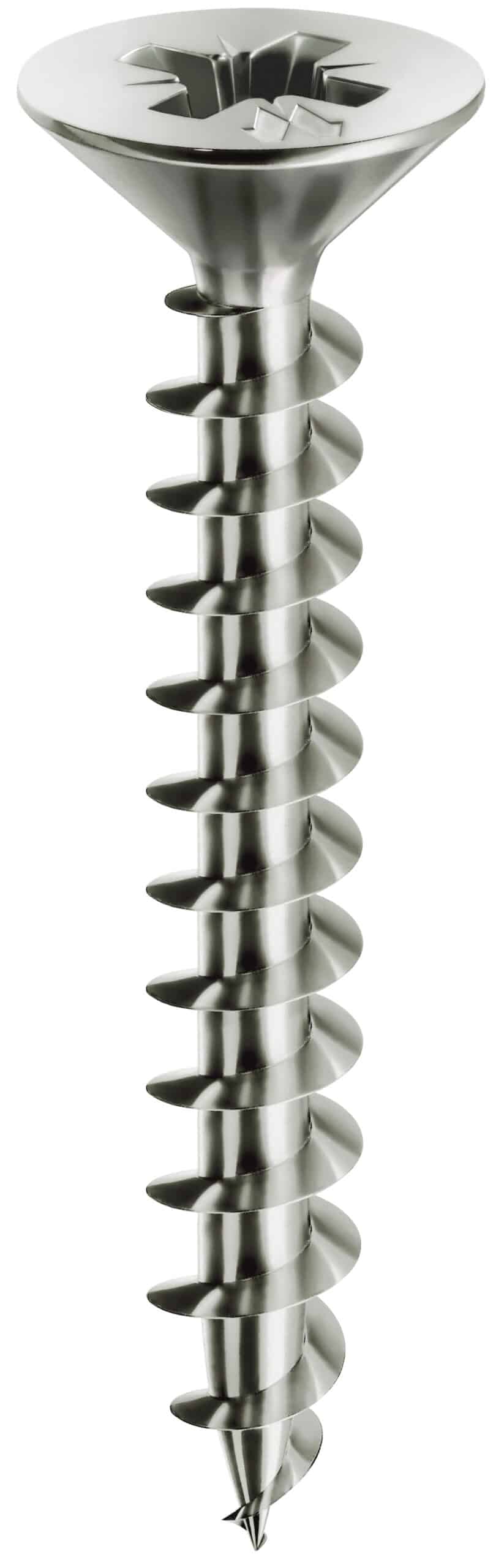 In acciaio Chromiting® (elevata resistenza alla corrosione), a testa svasata piana con nervature autosvasanti sottotesta, interamente filettata.