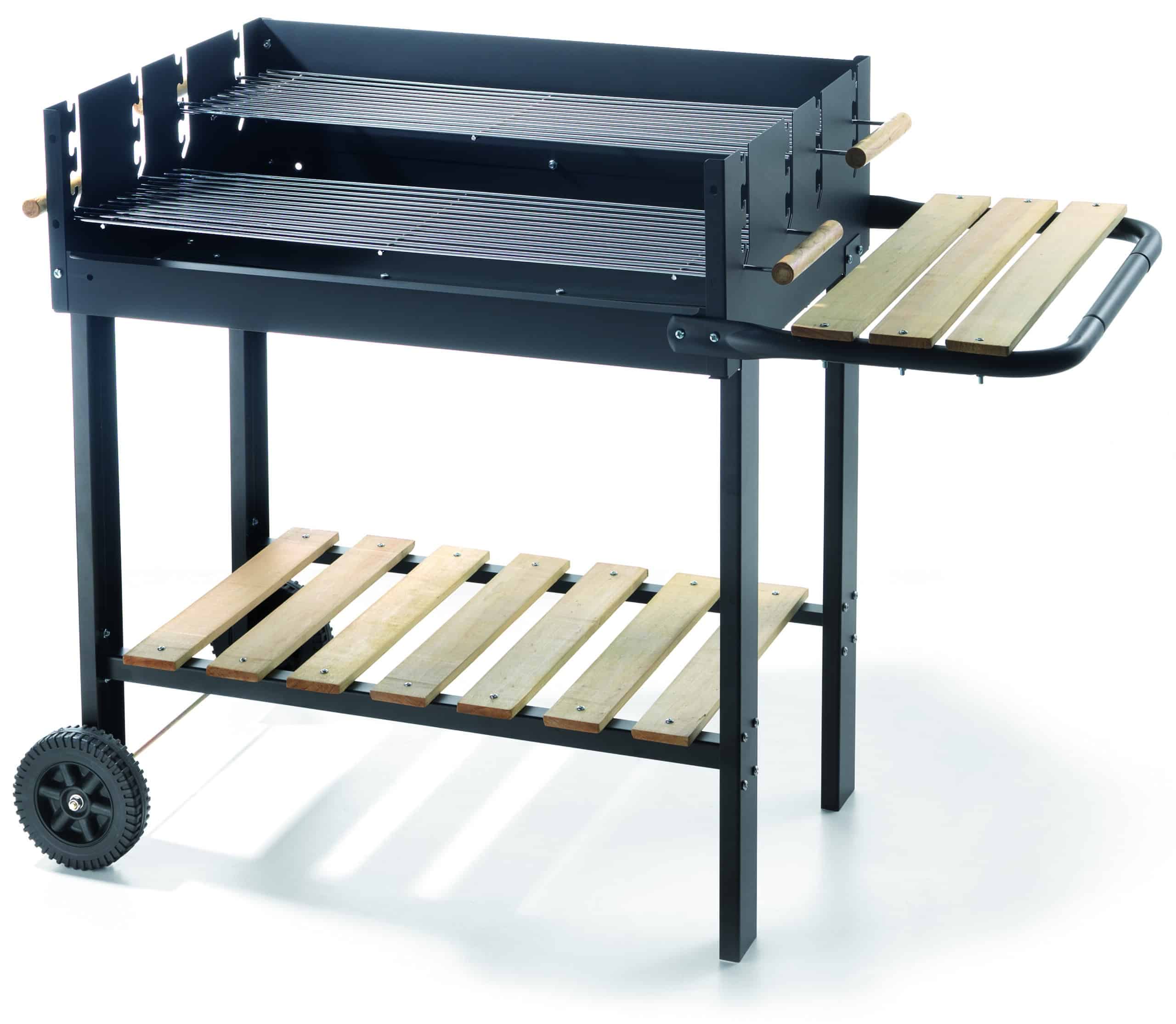 Robusta struttura in acciaio verniciato, elevata resistenza al fuoco (resiste fino a 500°C), completo di carrello, doppia griglia di cottura in acciaio cromato antigraffio regolabile in 4 posizioni con manici in legno antiscottatura, ripiani e mensole in legno massello, paravento in acciaio verniciato, dimensioni cm. 112x51x83 h.