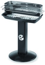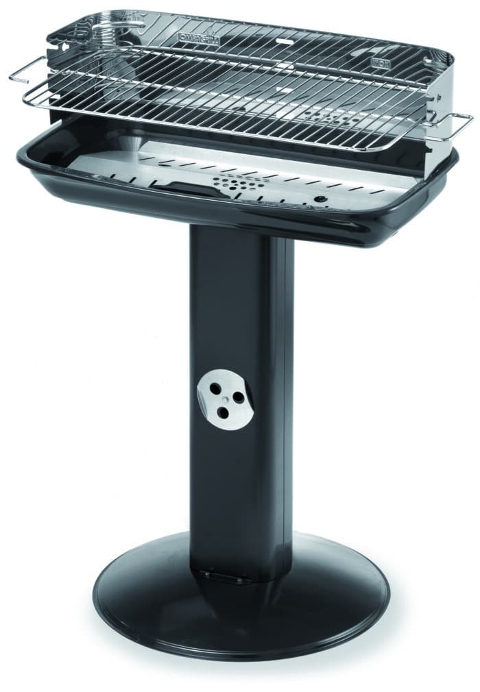 Robusta struttura in acciaio verniciato, griglia di cottura in acciaio cromato regolabile in 4 posizioni, braciere in acciaio alluminato, gamba a colonna con presa d’aria regolabile, paravento in acciaio inox con innesto di sicurezza, dimensioni cm. 65,5×47,5×90 h.
