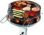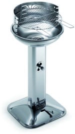 Robusta struttura in acciaio inox, griglia di cottura in acciaio cromato regolabile in 4 posizioni, braciere in acciaio inox, gamba a colonna con presa d’aria regolabile e dispositivo di accensione, raccogli-cenere e dispositivo di scarico, paravento con innesto di sicurezza e bordo antigraffio, dimensioni cm. 49,5×43,5×89,5 h.
