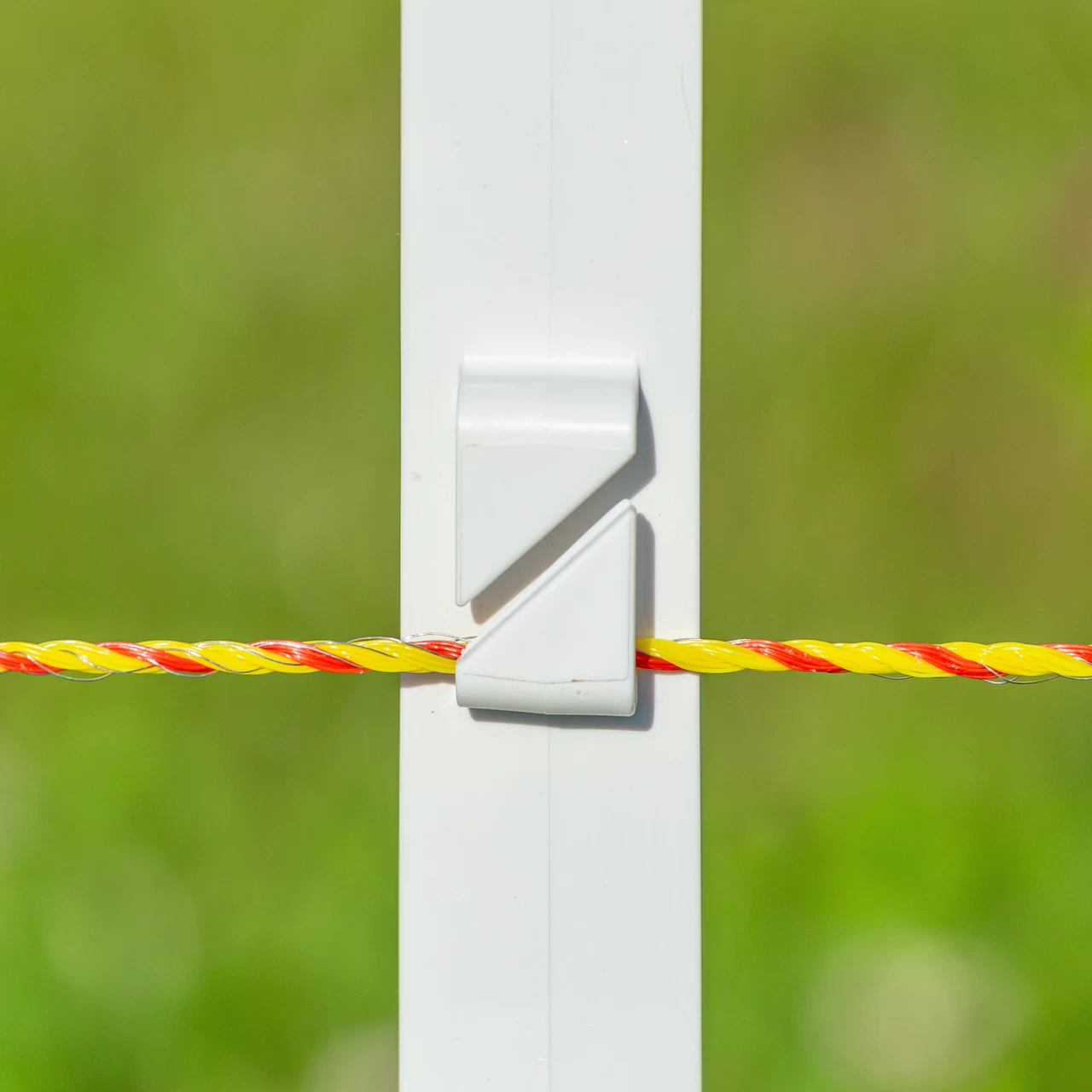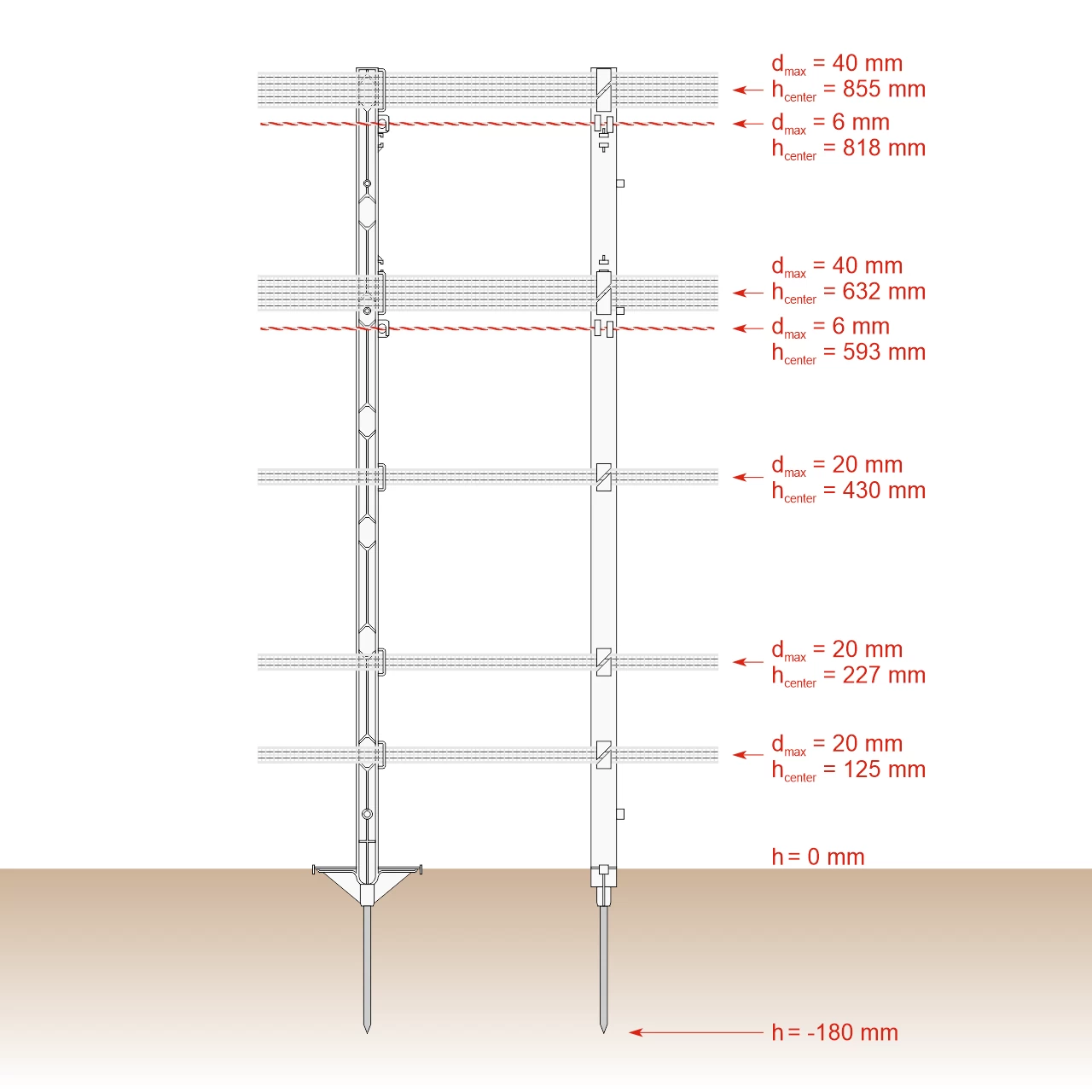 Utilizzando il palo non sono necessari isolatori separati: il palo è fornito a diverse altezze con sedi per il filo e per il nastro di recinzione elettrica.