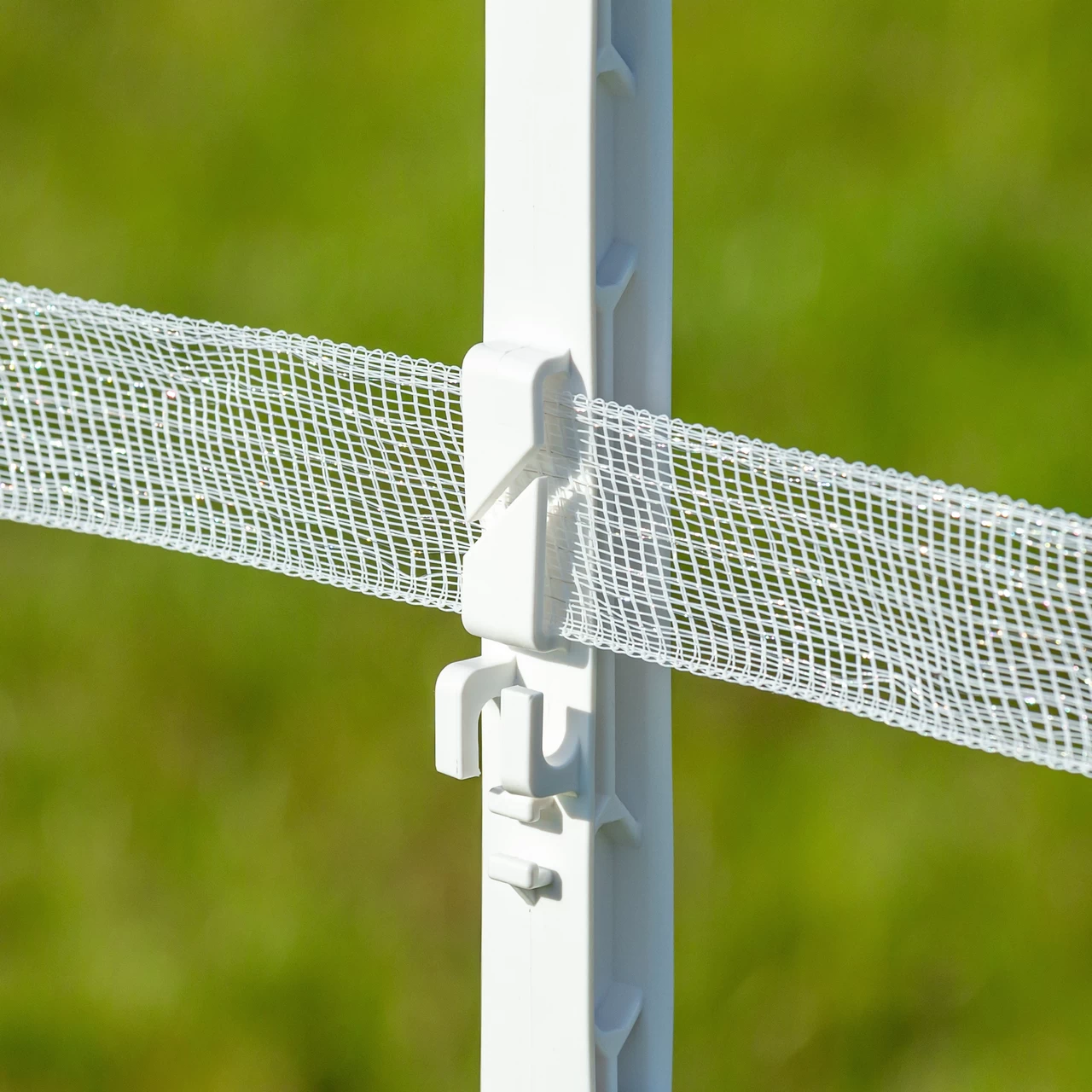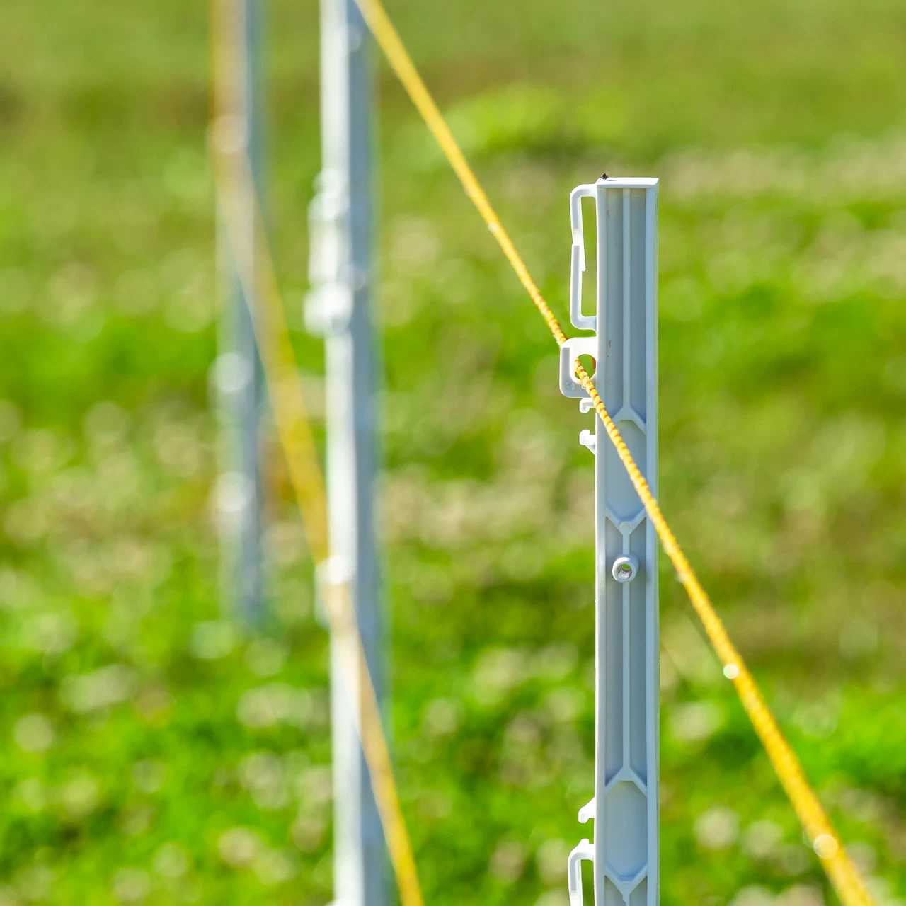 Nel caso di recinti con pali in plastica, è necessario utilizzare pali più resistenti agli angoli, ai cancelli e alle estremità, per garantire la stabilità derecinto. Inoltre, per i segmenti di recinto più lunghi, si consiglia di posizionare pali di rinforzo intermedi ogni 25-50 metri.