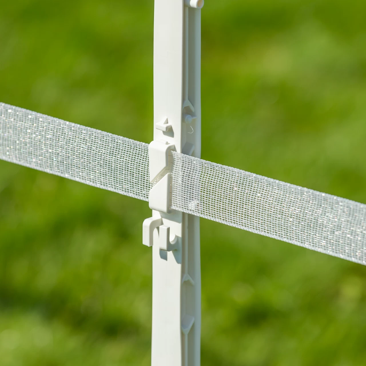 Nel caso di recinti con pali in plastica, è necessario utilizzare pali più resistenti agli angoli, ai cancelli e alle estremità, per garantire la stabilità derecinto. Inoltre, per i segmenti di recinto più lunghi, si consiglia di posizionare pali di rinforzo intermedi ogni 25-50 metri.