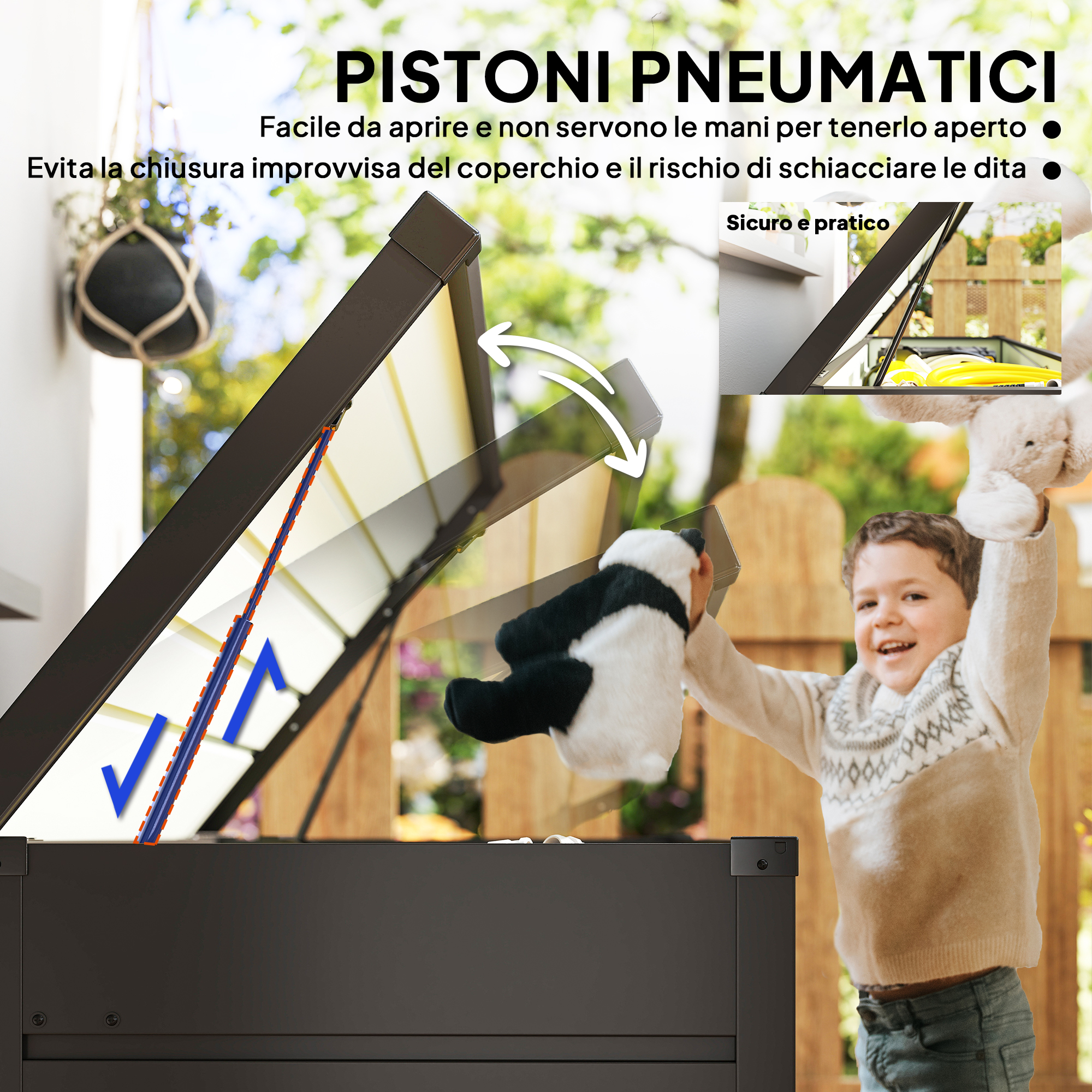 • • Coperchio ampio per proteggere l’interno della cassapanca dalla pioggia