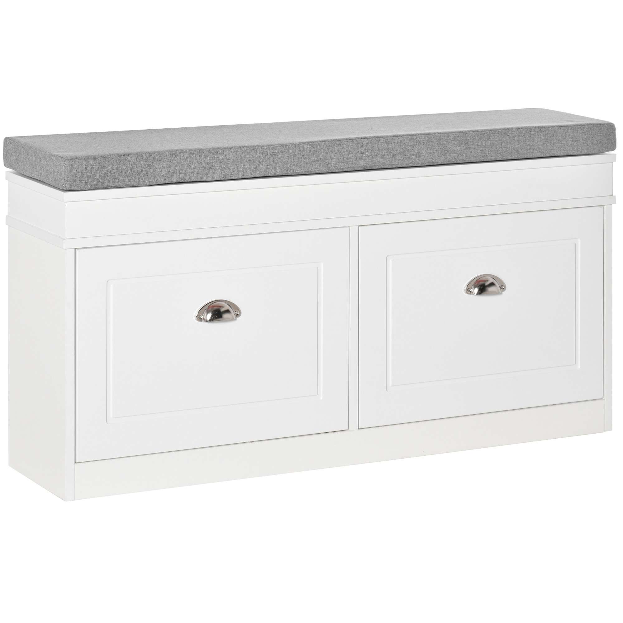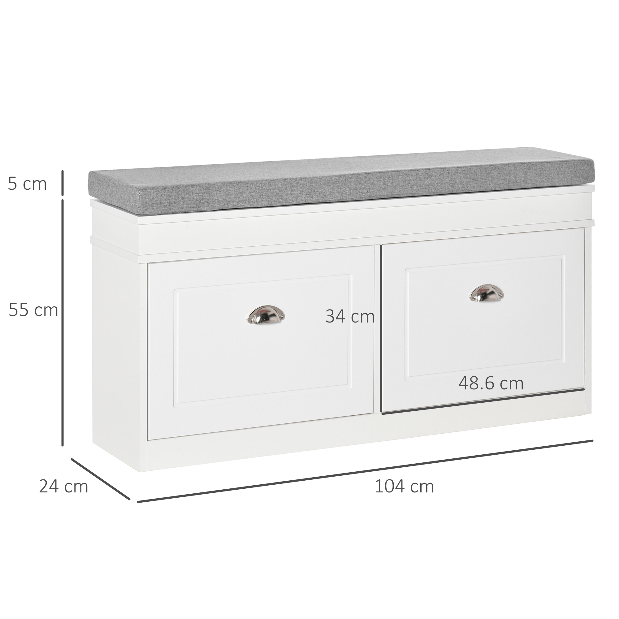 Panca Scarpiera Salvaspazio in Legno con Cuscino, 2 Cassetti con Mensola Regolabile per 8 Scarpe, 104x24x55cm, Bianco