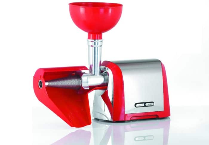 Per uso domestico, filtro in acciaio inox, corpo macchina in alluminio pressofuso, elica in acetalica per alimenti, imbuto, sgocciolatoio e pestello in polipropilene, interruttore on/off con inversione di marcia.
