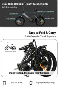La sospensione anteriore ammortizzata assorbe vibrazioni e asperità del terreno, migliorando il comfort su tragitti lunghi. La sella ergonomica e la posizione di guida verticale riducono l’affaticamento, rendendo la bici elettrica pieghevole 500W Wind1 perfetta per commuting urbano e uscite fuori porta.