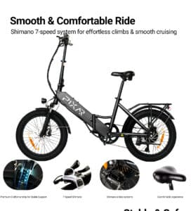 La PIXAR WIND1 è una bici elettrica pieghevole 500W compatta e potente, ideale per città e percorsi misti. Motore brushless 500W, batteria 48V 10.4Ah con celle EVE, ruote fat 20×3 Chaoyang e cambio Shimano 7 velocità. Autonomia reale fino a 55 km.