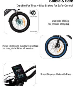 Le ruote fat Chaoyang da 20×3 pollici, resistenti alle forature, offrono un’eccellente stabilità su asfalto, pavé, ghiaia e sterrati leggeri. La forcella ammortizzata anteriore regolabile assorbe efficacemente urti e vibrazioni, migliorando il comfort durante la guida su superfici irregolari.