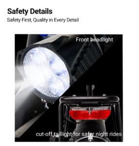 La PIXAR WIND1 è dotata di faro anteriore LED e fanale posteriore integrato con connessioni impermeabili, per garantire visibilità e sicurezza anche durante la guida notturna. È presente anche un clacson elettronico per una maggiore sicurezza nel traffico urbano.