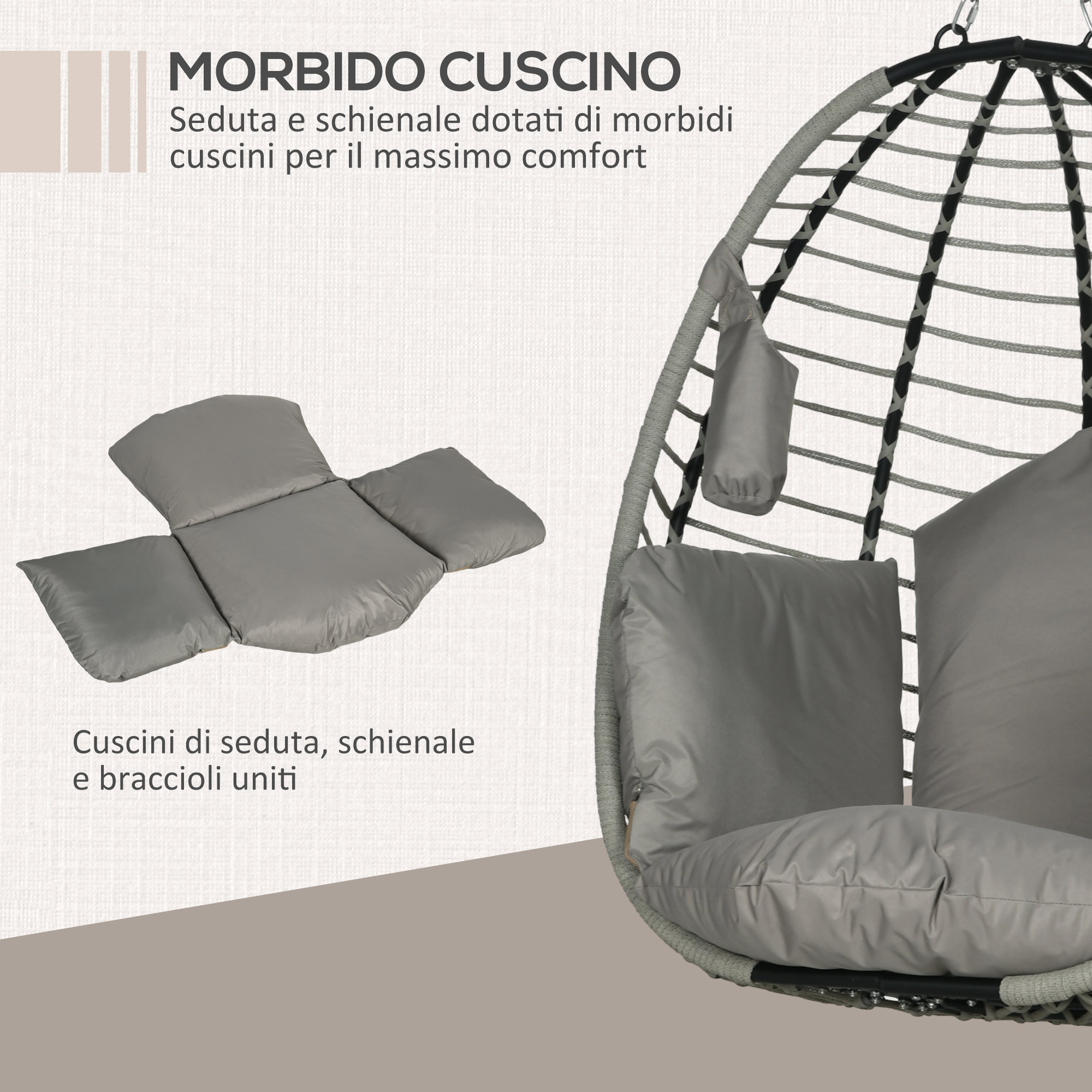 Per i tuoi momenti di ozio abbandonati sulla nostra poltrona sospesa da giardino [ITALFROM HOME DESIGN], Il design della sedia a uovo rende la seduta ampia e accogliente, e lo spesso cuscino ti avvolge per regalarti il comfort che meriti, Il telaio in acciaio assicura una resistenza al peso fino a 120 kg e la struttura pieghevole della poltrona appesa ti consente di riporla in poco spazio quando non la usi, Crea un angolo di comfort nel tuo giardino con la nostra sedia sospesa!