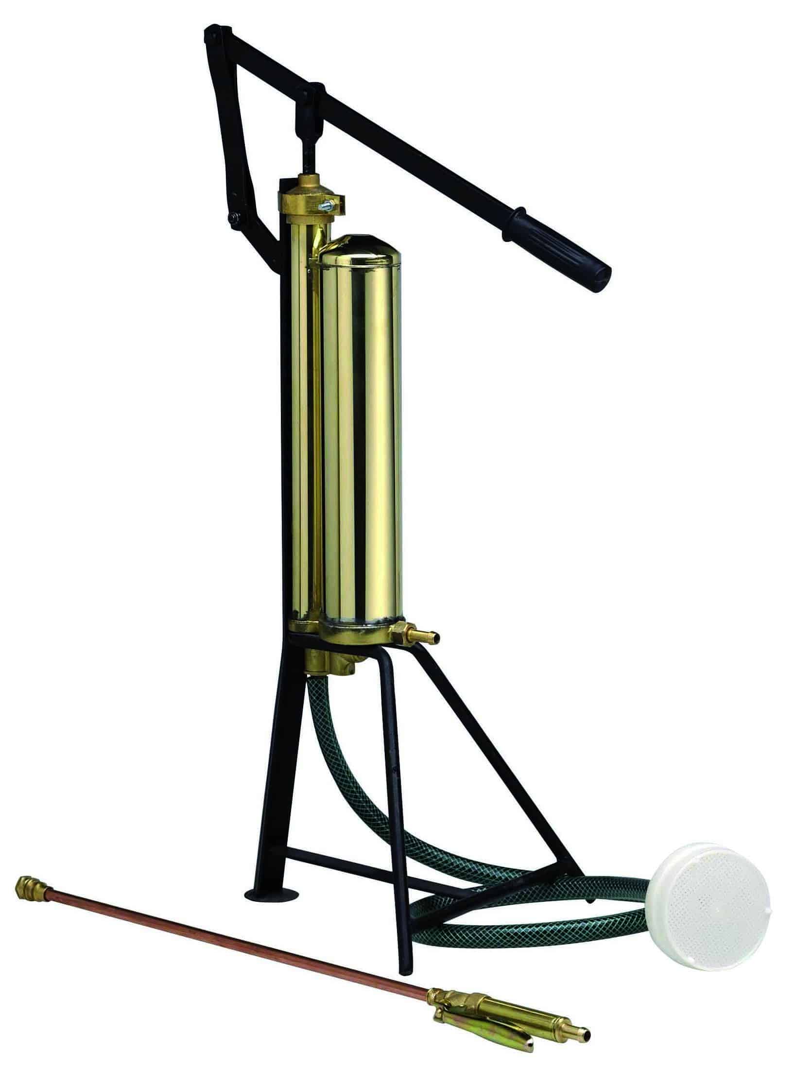 Interamente in ottone, valvole in acciaio inox. A leva, completa di lancia e tubo, poggia su cavalletto a 3 piedi.