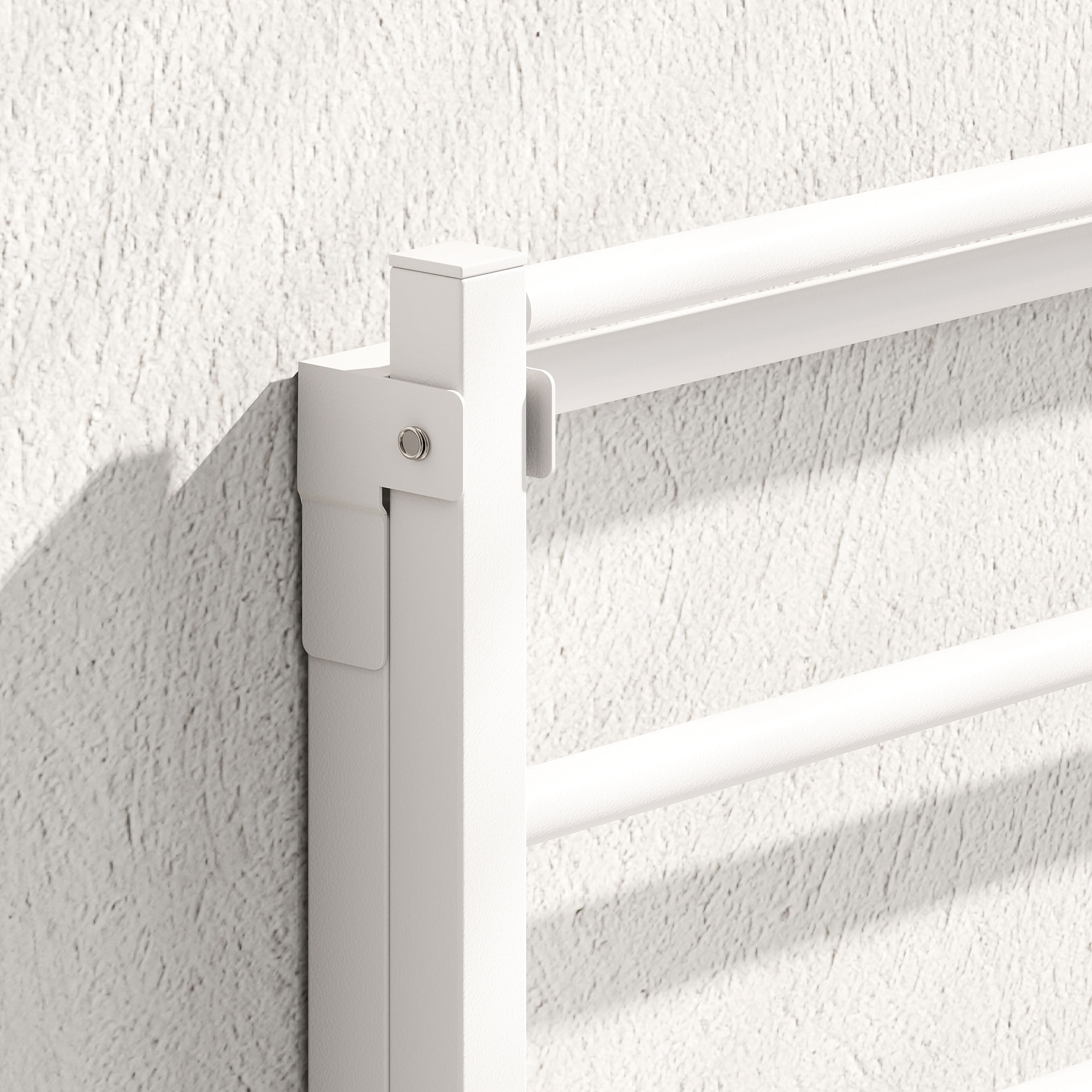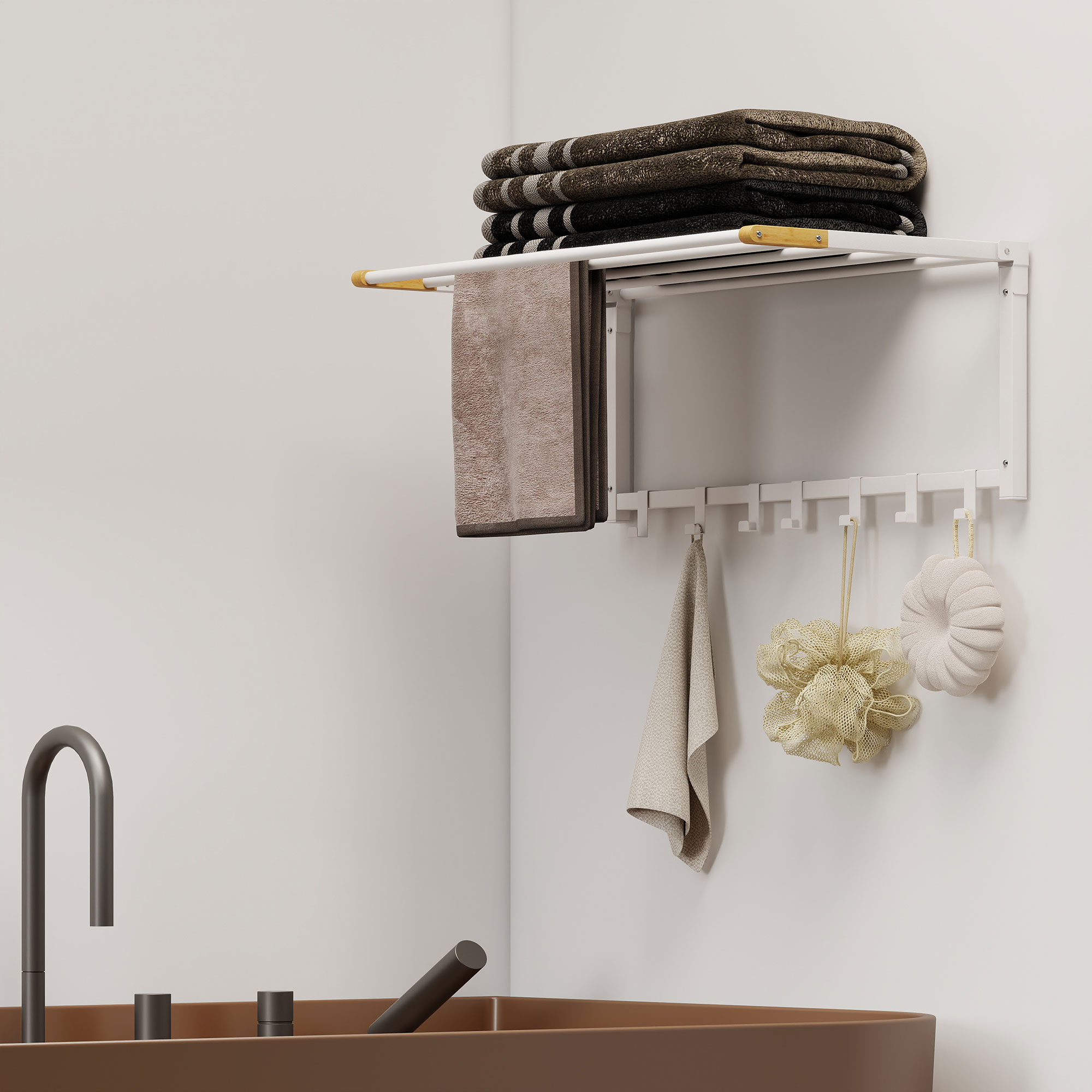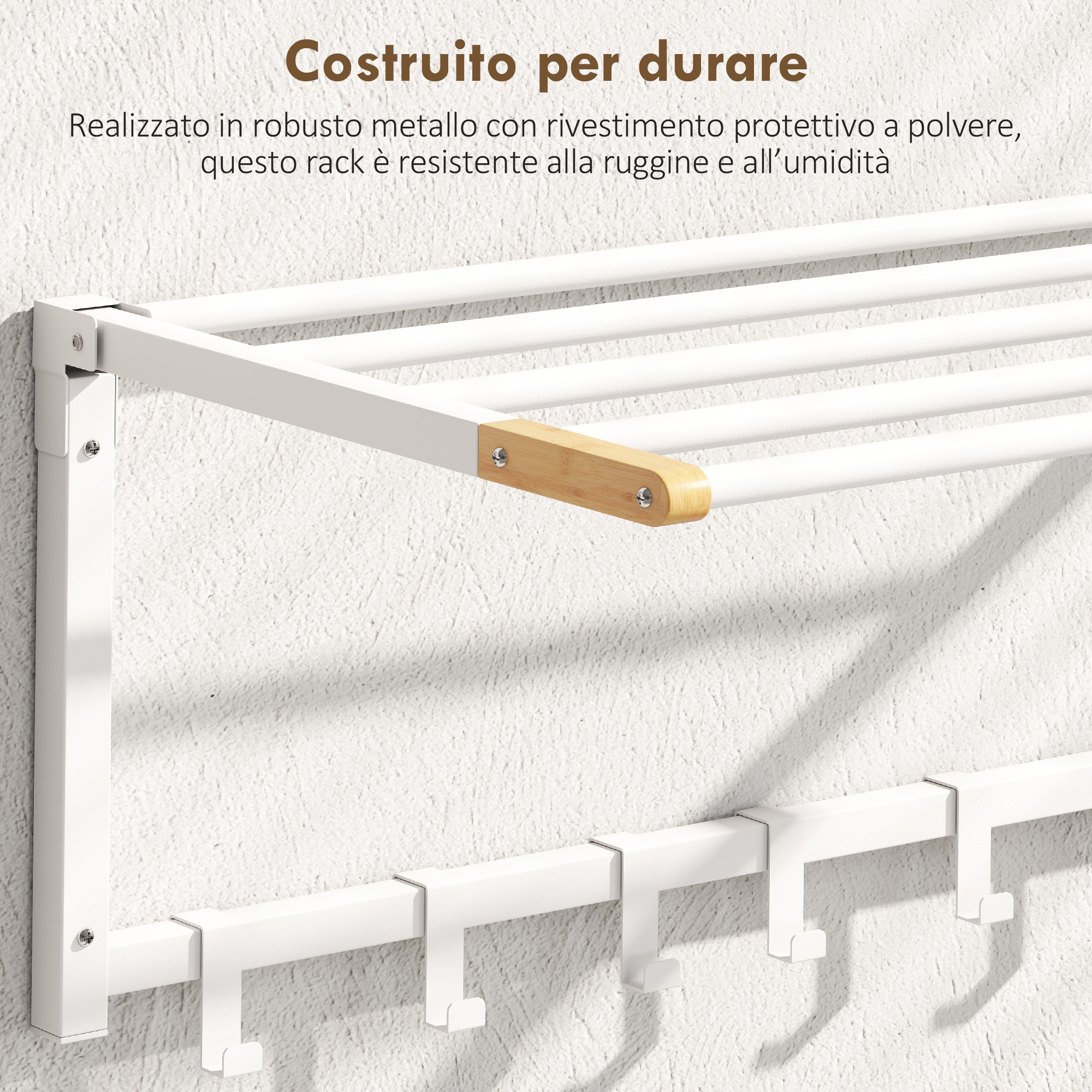 Portasciugamani a Parete Pieghevole con 5 Barre e 6 Ganci in Legno e Acciaio, 60×32,5×20 cm, Bianco