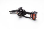 Sega elettrica a catena senza cavi di collegamento con batteria cordless, impugnatura supplementare ergonomica per lavorare a due mani, doppio interruttore di sicurezza, serbatoio dell’olio integrato con livello visibile, lubrificazione automatica della catena e display led per visualizzare carica della batteria e ore di lavoro.