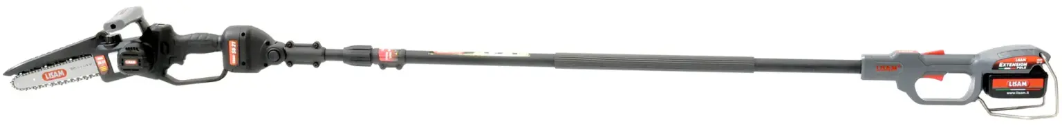 Sega elettrica a catena senza cavi di collegamento con batteria cordless, impugnatura supplementare ergonomica per lavorare a due mani, doppio interruttore di sicurezza, serbatoio dell’olio integrato con livello visibile, lubrificazione automatica della catena e display led per visualizzare carica della batteria e ore di lavoro.