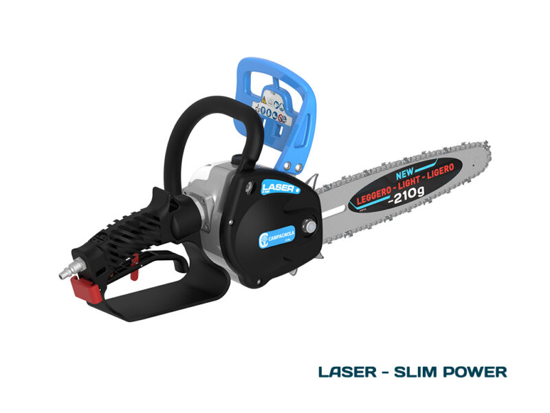 Il potatore pneumatico a catena LASER è unico per velocità, potenza, silenziosità e assenza di vibrazioni e di emissioni di gas di scarico. Questo attrezzo professionale è composto da un corpo in lega di magnesio, da un’impugnatura ergonomica e da un paramano con freno della catena, la cui lubrificazione avviene automaticamente tramite il ricorso a una pompa.