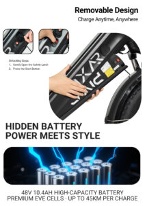 La Ride1 utilizza una batteria Samsung 36V 15,6Ah con certificazione CE e grado di impermeabilità IPX6. L’autonomia arriva fino a 80 km in pedalata assistita e circa 50 km in modalità solo elettrica. Il tempo di ricarica varia da 4 a 5 ore.