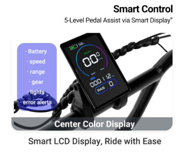 Il display LCD da 3,0” mostra velocità, livello PAS, distanza percorsa e carica residua della batteria. La Ride1 utilizza un sistema PAS regolabile su 5 livelli e un cambio Shimano a 21 velocità che consente di adattarsi a qualsiasi pendenza.