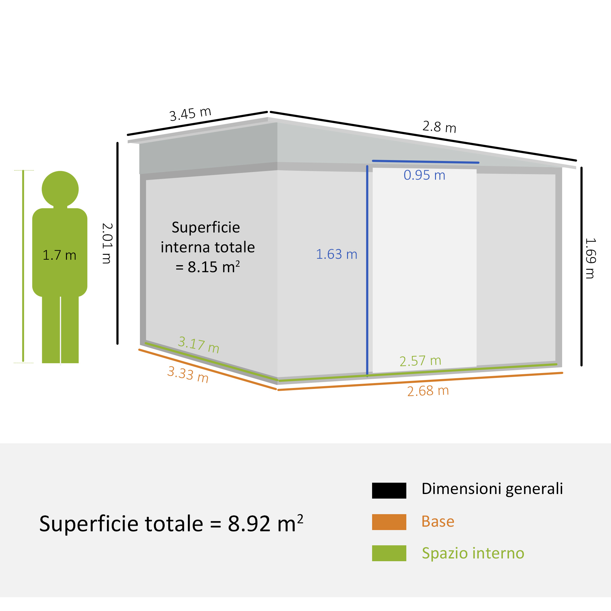 - • Dimensione inferiore: 333,5L x 268,5Pcm (8,9m²)